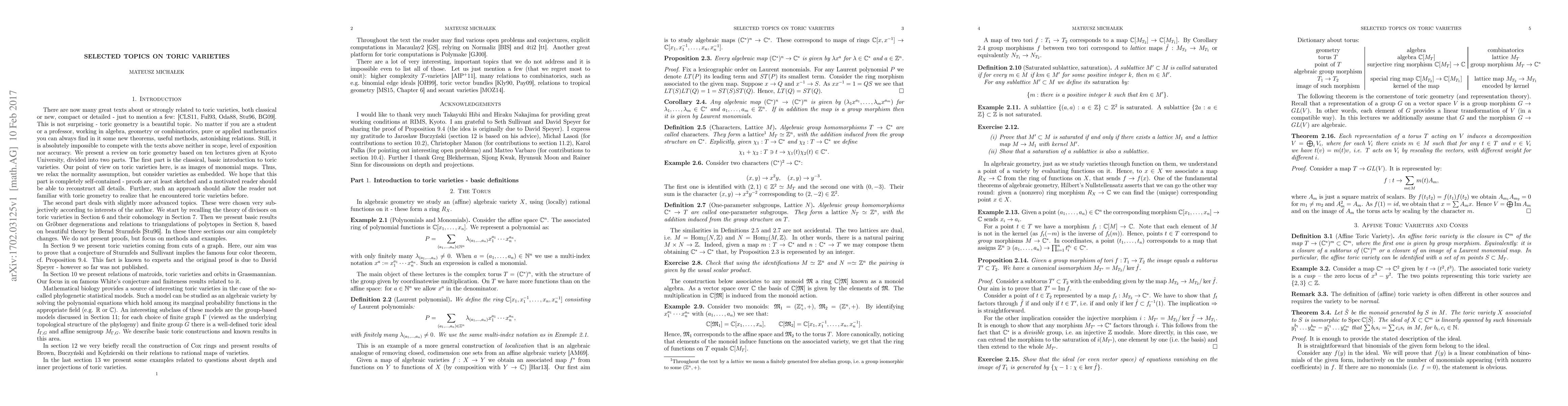This article is based on a series of lectures on toric varieties given at RIMS, Kyoto. We start by introducing toric varieties, their basic properties and later pass to more advanced topics relating mostly to combinatorics.
