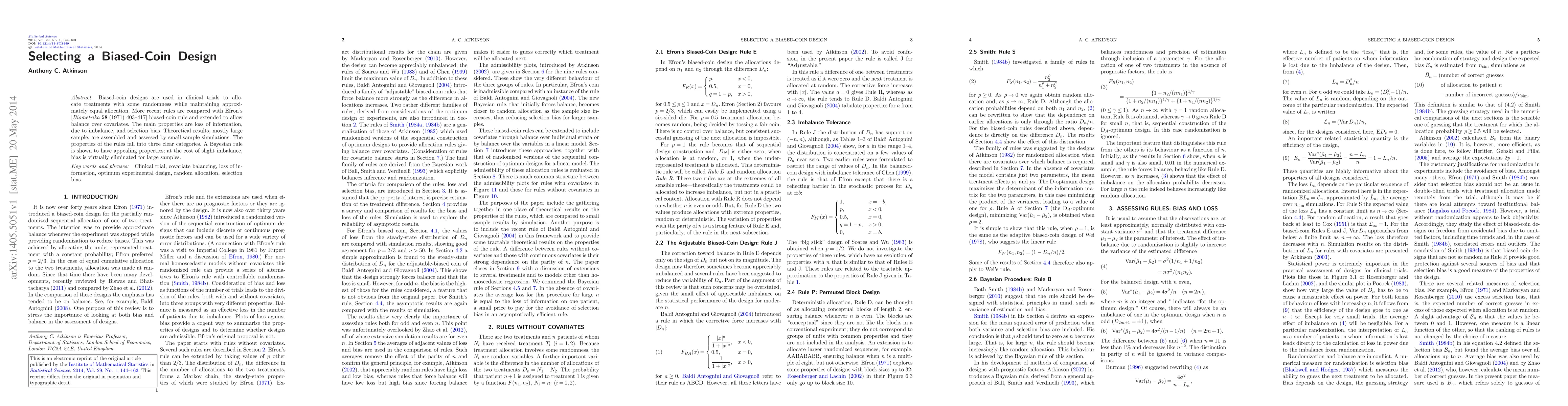 Biased-coin designs are used in clinical trials to allocate treatments with some randomness while maintaining approximately equal allocation. More recent rules are compared with Efron's [Biometrika 58 (1971) 403-417] biased-coin rule and extended to allow balance over covariates. The main properties are loss of information, due to imbalance, and selection bias. Theoretical results, mostly large sample, are assembled and assessed by small-sample simulations. The properties of the rules fall into three clear categories. A Bayesian rule is shown to have appealing properties; at the cost of slight imbalance, bias is virtually eliminated for large samples.