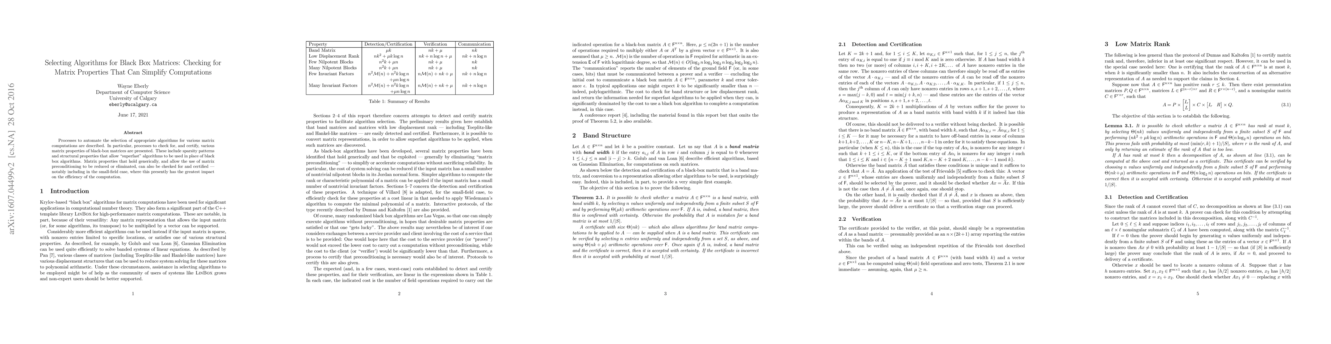 Processes to automate the selection of appropriate algorithms for various matrix computations are described. In particular, processes to check for, and certify, various matrix properties of black box matrices are presented. These include sparsity patterns and structural properties that allow "superfast" algorithms to be used in place of black-box algorithms. Matrix properties that hold generically, and allow the use of matrix preconditioning to be reduced or eliminated, can also be checked for and certified - notably including in the small-field case, where this presently has the greatest impact on the efficiency of the computation.