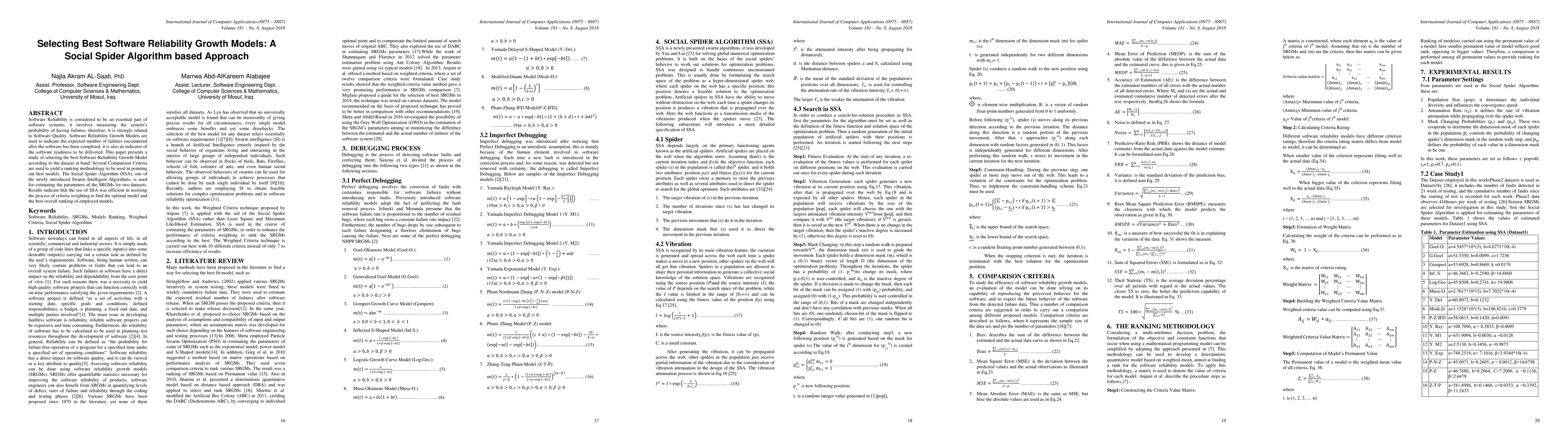 Software Reliability is considered to be an essential part of software systems; it involves measuring the system's probability of having failures; therefore, it is strongly related to Software Quality. Software Reliability Growth Models are used to indicate the expected number of failures encountered after the software has been completed, it is also an indicator of the software readiness to be delivered. This paper presents a study of selecting the best Software Reliability Growth Model according to the dataset at hand. Several Comparison Criteria are used to yield a ranking methodology to be used in pointing out best models. The Social Spider Algorithm SSA, one of the newly introduced Swarm Intelligent Algorithms, is used for estimating the parameters of the SRGMs for two datasets. Results indicate that the use of SSA was efficient in assisting the process of criteria weighting to find the optimal model and the best overall ranking of employed models.