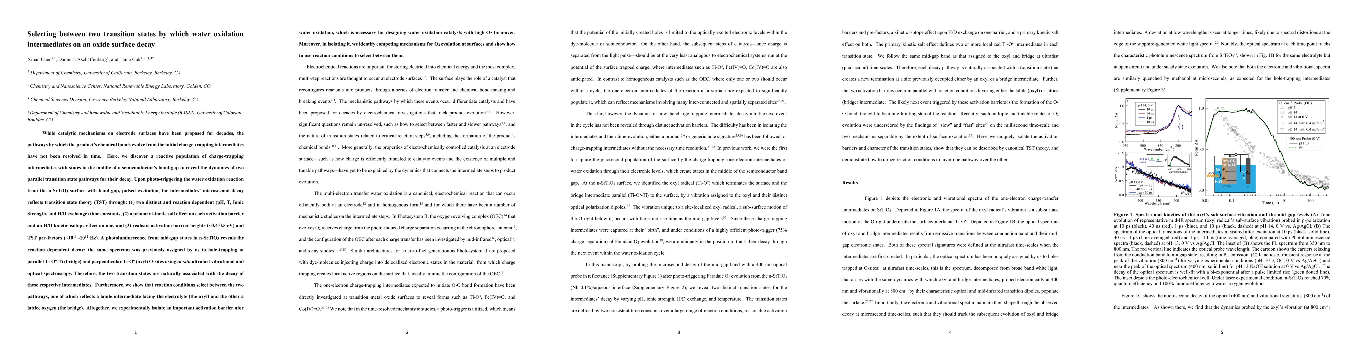 This paper reveals two parallel transition state pathways for water oxidation intermediates on n-SrTiO3 surfaces, identified through photo-triggering and time-resolved spectroscopy. The study demonstrates how reaction conditions can select between these pathways, providing insights into the design of efficient water oxidation catalysts.