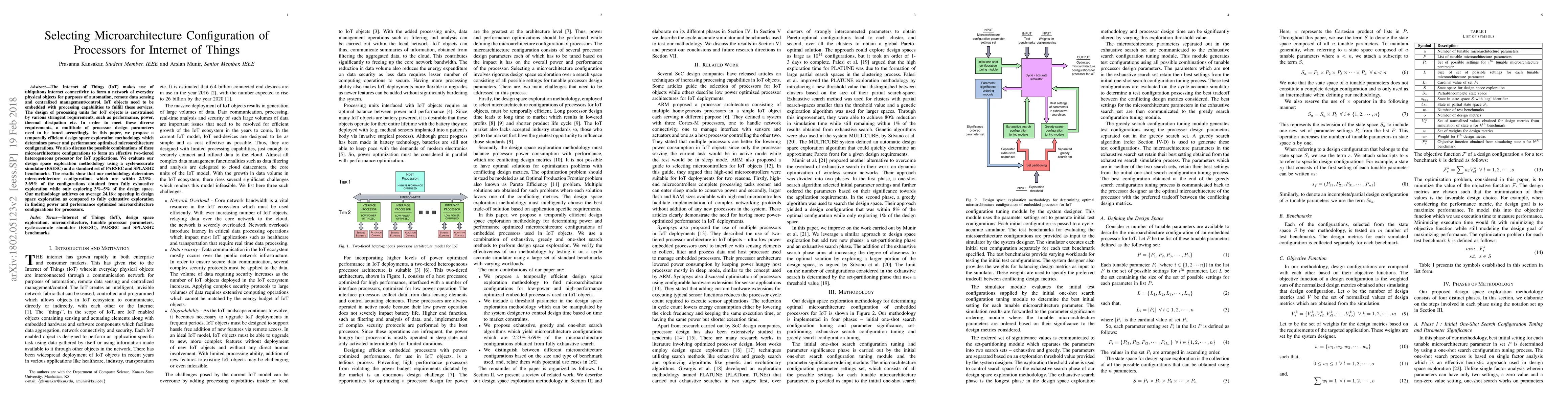 The Internet of Things (IoT) makes use of ubiquitous internet connectivity to form a network of everyday physical objects for purposes of automation, remote data sensing and centralized management/control. IoT objects need to be embedded with processing capabilities to fulfill these services. The design of processing units for IoT objects is constrained by various stringent requirements, such as performance, power, thermal dissipation etc. In order to meet these diverse requirements, a multitude of processor design parameters need to be tuned accordingly. In this paper, we propose a temporally efficient design space exploration methodology which determines power and performance optimized microarchitecture configurations. We also discuss the possible combinations of these microarchitecture configurations to form an effective two-tiered heterogeneous processor for IoT applications. We evaluate our design space exploration methodology using a cycle-accurate simulator (ESESC) and a standard set of PARSEC and SPLASH2 benchmarks. The results show that our methodology determines microarchitecture configurations which are within 2.23%-3.69% of the configurations obtained from fully exhaustive exploration while only exploring 3%-5% of the design space. Our methodology achieves on average 24.16x speedup in design space exploration as compared to fully exhaustive exploration in finding power and performance optimized microarchitecture configurations for processors.