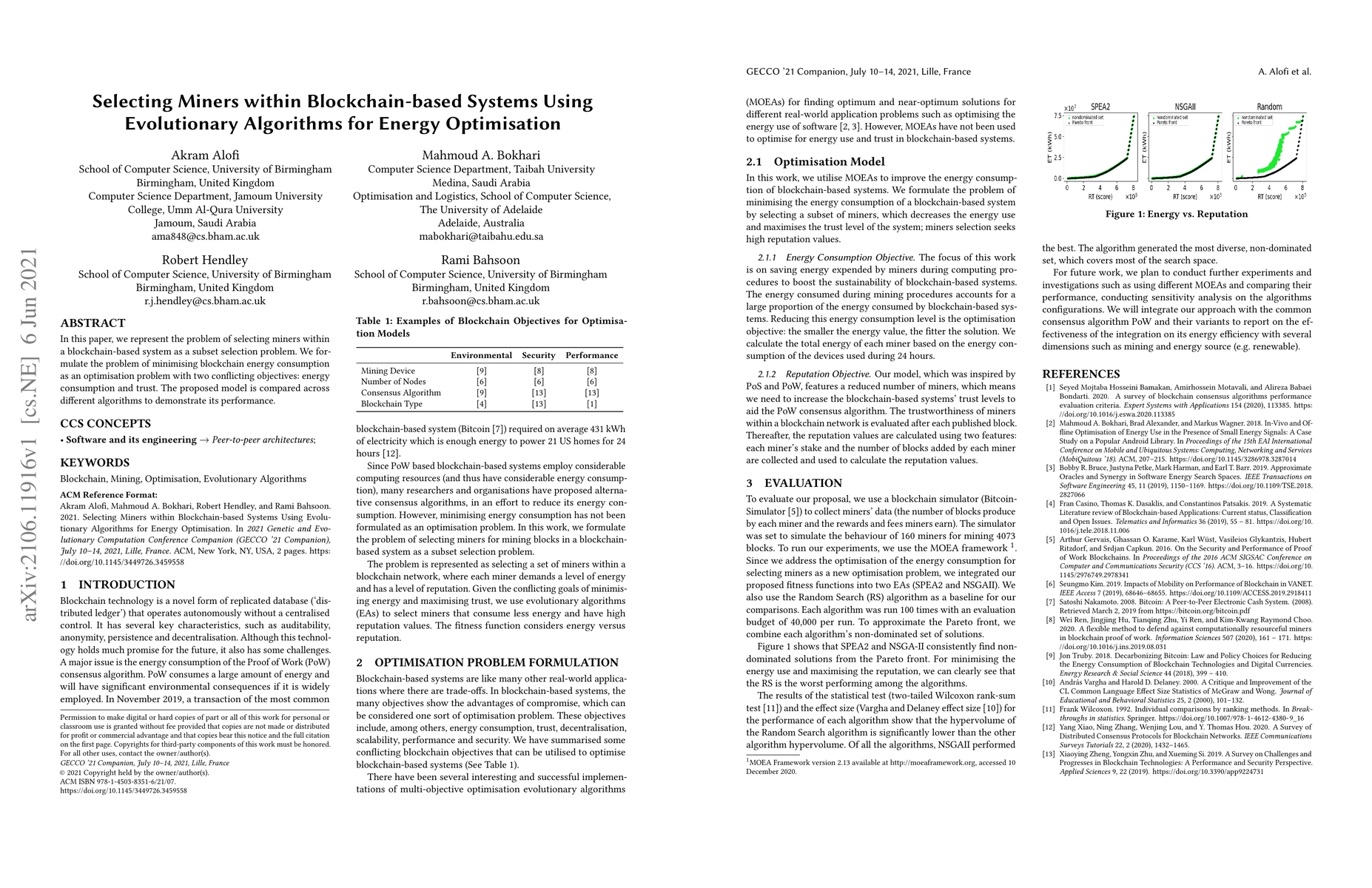 In this paper, we represent the problem of selecting miners within a blockchain-based system as a subset selection problem. We formulate the problem of minimising blockchain energy consumption as an optimisation problem with two conflicting objectives: energy consumption and trust. The proposed model is compared across different algorithms to demonstrate its performance.