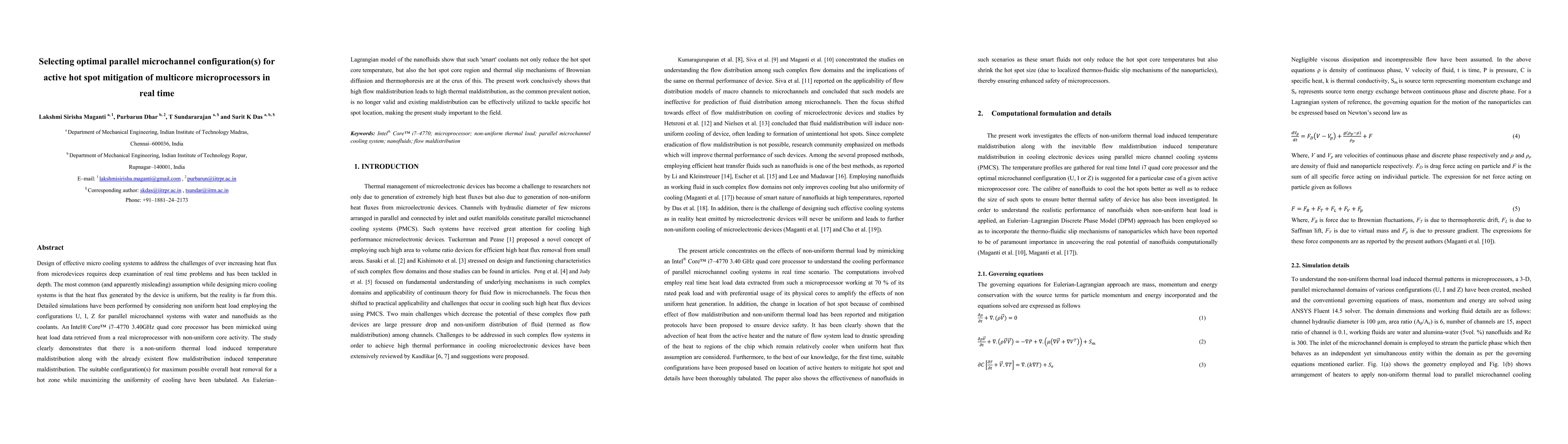 This paper investigates optimal parallel microchannel configurations for mitigating non-uniform heat hotspots in multicore microprocessors. It demonstrates that high flow maldistribution can be leveraged to target specific hot zones, thereby improving cooling efficiency and uniformity, and highlights the effectiveness of nanofluids in reducing hot spot temperatures.