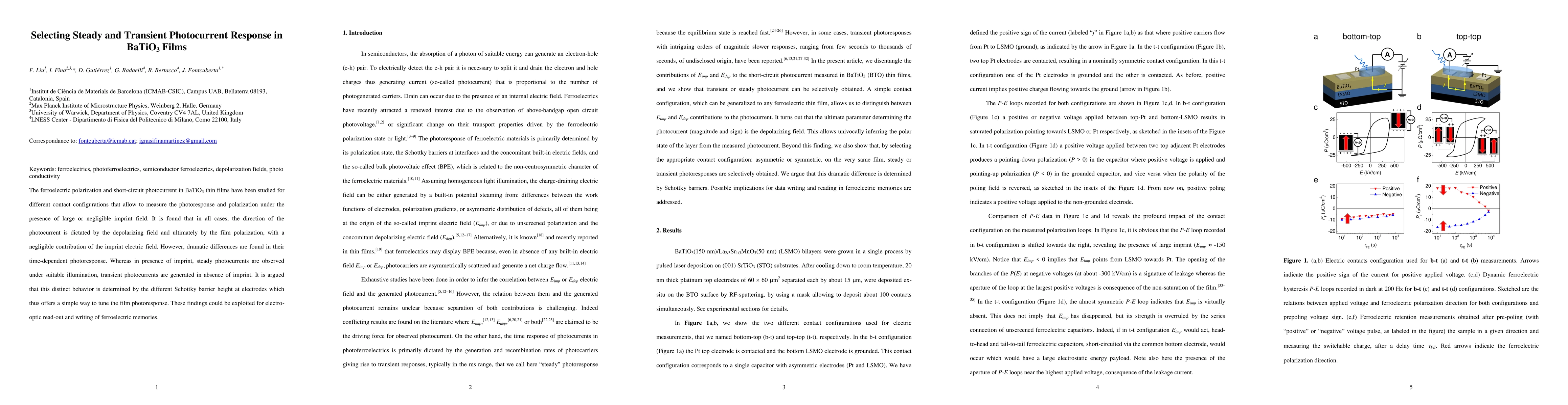 The ferroelectric polarization and short-circuit photocurrent in BaTiO3 thin films have been studied for different contact configurations that allow to measure the photoresponse and polarization under the presence of large or negligible imprint field. It is found that in all cases, the direction of the photocurrent is dictated by the depolarizing field and ultimately by the film polarization, with a negligible contribution of the imprint electric field. However, dramatic differences are found in their time-dependent photoresponse. Whereas in presence of imprint, steady photocurrents are observed under suitable illumination, transient photocurrents are generated in absence of imprint. It is argued that this distinct behavior is determined by the different Schottky barrier height at electrodes which thus offers a simple way to tune the film photoresponse. These findings could be exploited for electro-optic read-out and writing of ferroelectric memories.