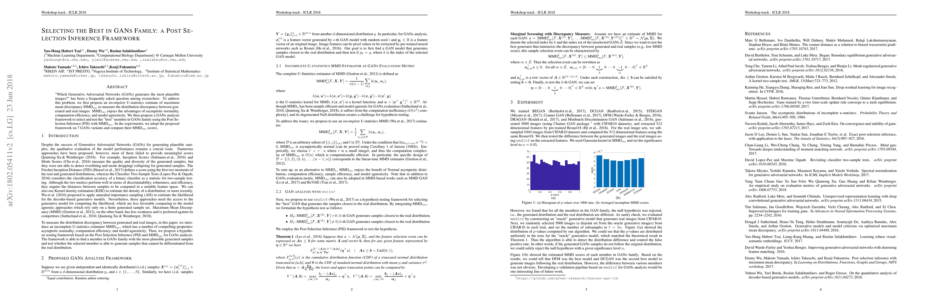 "Which Generative Adversarial Networks (GANs) generates the most plausible images?" has been a frequently asked question among researchers. To address this problem, we first propose an \emph{incomplete} U-statistics estimate of maximum mean discrepancy $\mathrm{MMD}_{inc}$ to measure the distribution discrepancy between generated and real images. $\mathrm{MMD}_{inc}$ enjoys the advantages of asymptotic normality, computation efficiency, and model agnosticity. We then propose a GANs analysis framework to select and test the "best" member in GANs family using the Post Selection Inference (PSI) with $\mathrm{MMD}_{inc}$. In the experiments, we adopt the proposed framework on 7 GANs variants and compare their $\mathrm{MMD}_{inc}$ scores.