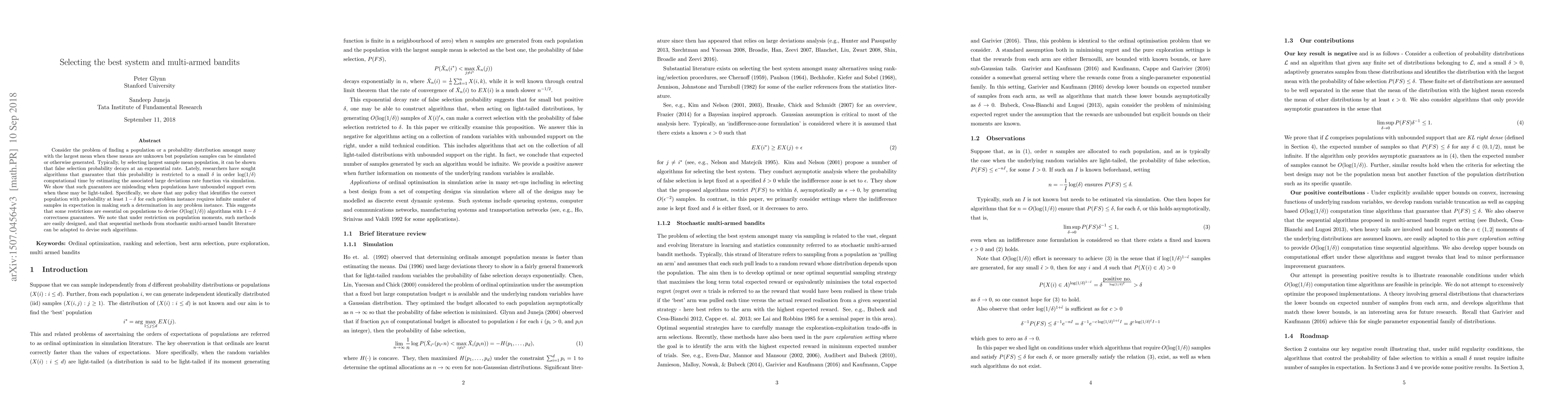This paper discusses the challenge of selecting the population with the largest mean from multiple populations when sample means are unknown, highlighting that traditional algorithms guaranteeing small false selection probabilities fail for populations with unbounded support. It concludes that restrictions on population moments are necessary to design efficient algorithms with high correctness guarantees.