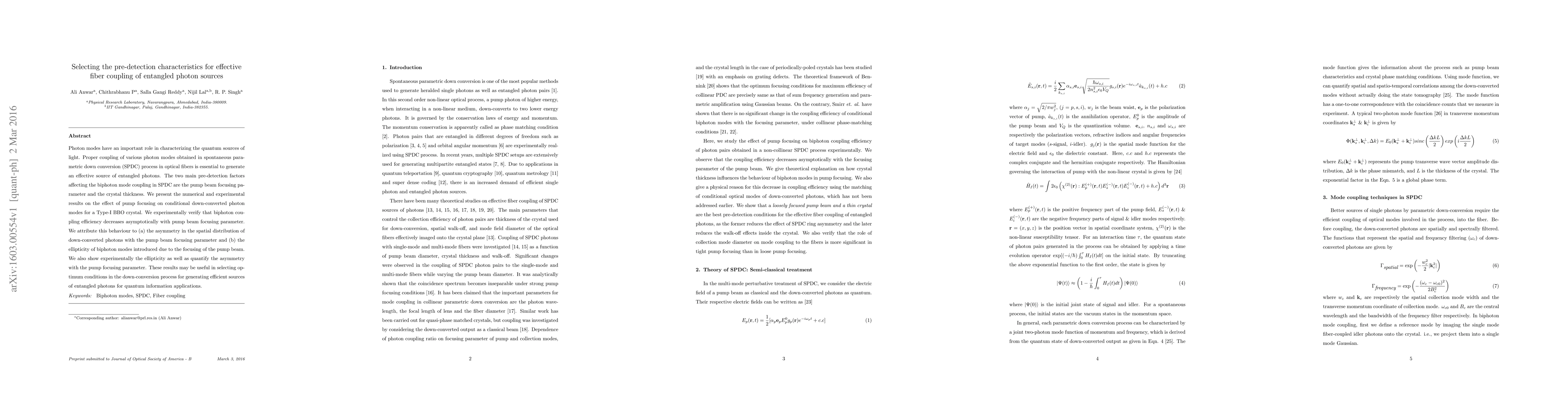 Photon modes have an important role in characterizing the quantum sources of light. Proper coupling of various photon modes obtained in spontaneous parametric down conversion (SPDC) process in optical fibers is essential to generate an effective source of entangled photons. The two main pre-detection factors affecting the biphoton mode coupling in SPDC are the pump beam focusing parameter and the crystal thickness. We present the numerical and experimental results on the effect of pump focusing on conditional down-converted photon modes for a Type-I BBO crystal. We experimentally verify that biphoton coupling efficiency decreases asymptotically with pump beam focusing parameter. We attribute this behaviour to (a) the asymmetry in the spatial distribution of down-converted photons with the pump beam focusing parameter and (b) the ellipticity of biphoton modes introduced due to the focusing of the pump beam. We also show experimentally the ellipticity as well as quantify the asymmetry with the pump focusing parameter. These results may be useful in selecting optimum conditions in the down-conversion process for generating efficient sources of entangled photons for quantum information applications.