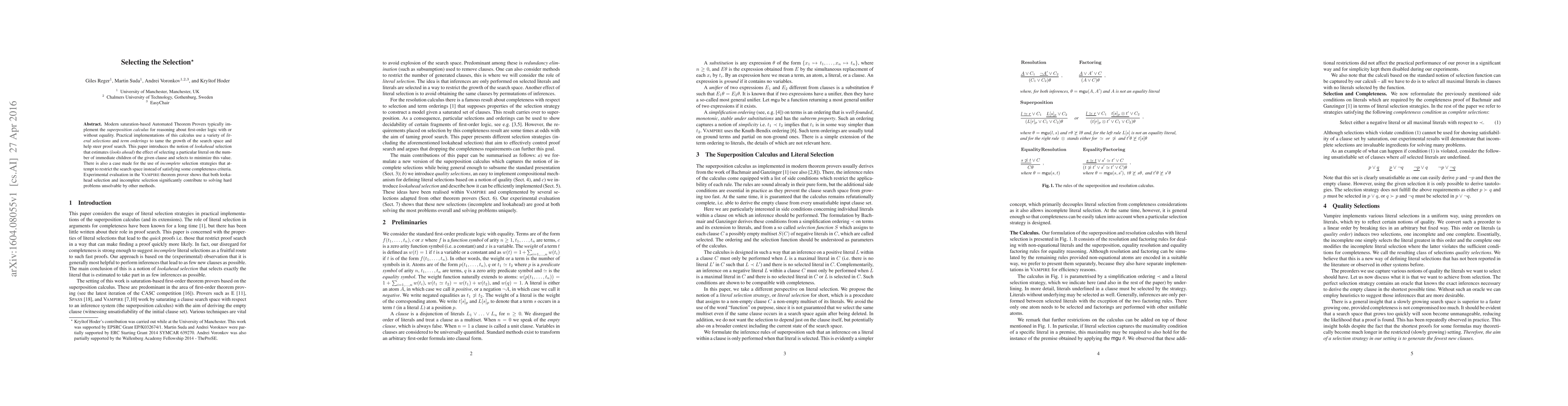 Modern saturation-based Automated Theorem Provers typically implement the superposition calculus for reasoning about first-order logic with or without equality. Practical implementations of this calculus use a variety of literal selections and term orderings to tame the growth of the search space and help steer proof search. This paper introduces the notion of lookahead selection that estimates (looks ahead) the effect on the search space of selecting a literal. There is also a case made for the use of incomplete selection functions that attempt to restrict the search space instead of satisfying some completeness criteria. Experimental evaluation in the \Vampire\ theorem prover shows that both lookahead selection and incomplete selection significantly contribute to solving hard problems unsolvable by other methods.