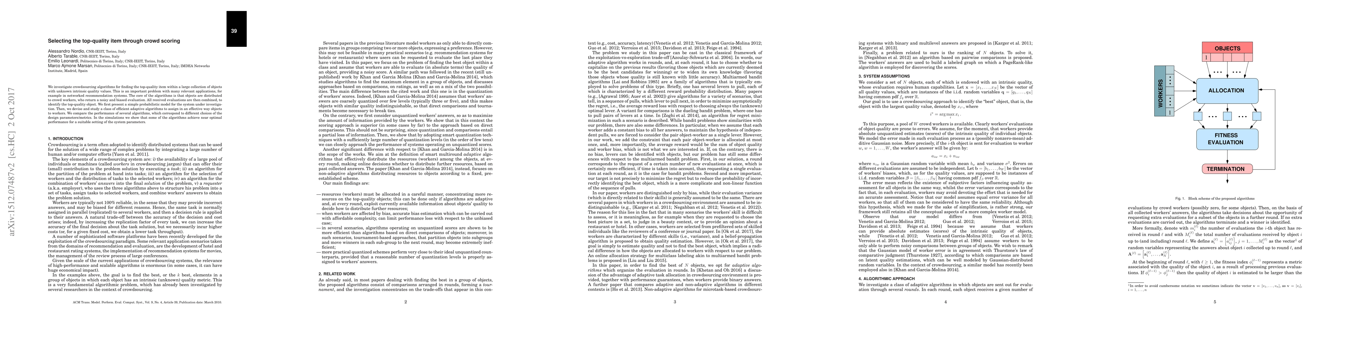 This paper explores crowdsourcing methods to identify the highest quality item from a large, unranked collection using noisy crowd evaluations. It introduces probabilistic models and adaptive algorithms for efficient object distribution to workers. Simulations demonstrate near-optimal performance for specific parameter settings.
