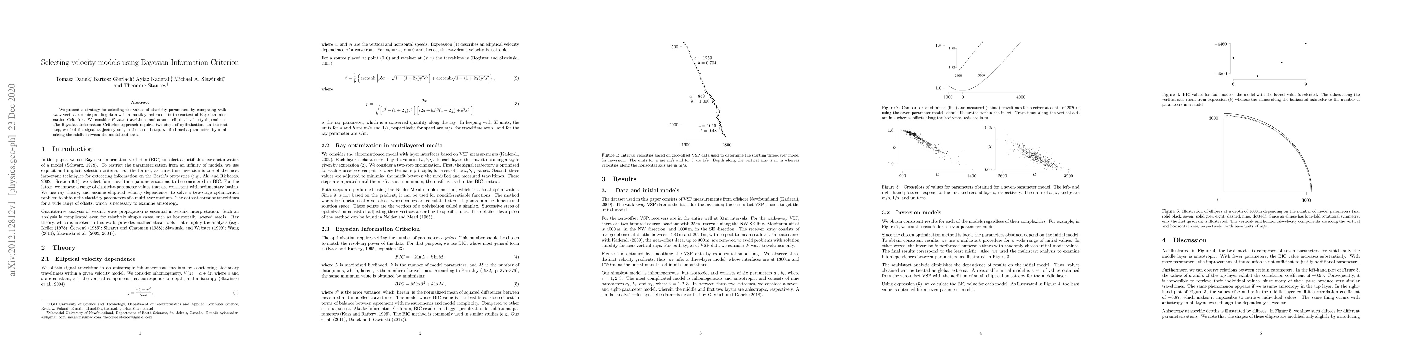 We present a strategy for selecting the values of elasticity parameters by comparing walk-away vertical seismic profiling data with a multilayered model in the context of Bayesian Information Criterion. We consider $P$-wave traveltimes and assume elliptical velocity dependence. The Bayesian Information Criterion approach requires two steps of optimization. In the first step, we find the signal trajectory and, in the second step, we find media parameters by minimizing the misfit between the model and data.