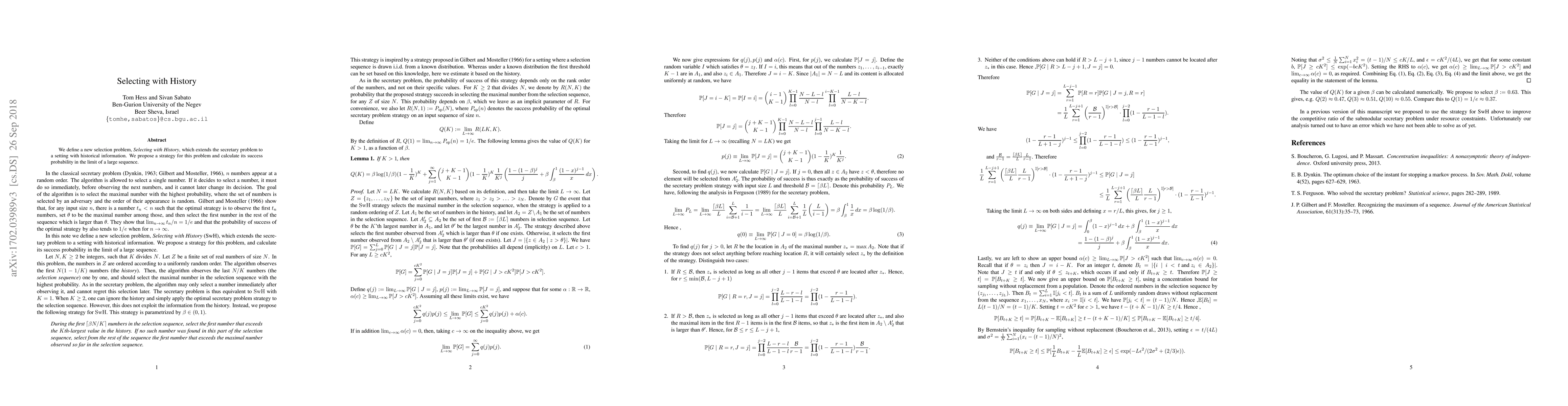 This paper introduces 'Selecting with History', a new selection problem that builds upon the secretary problem by incorporating historical data. The authors propose a strategy and determine its success probability for an extensive sequence.