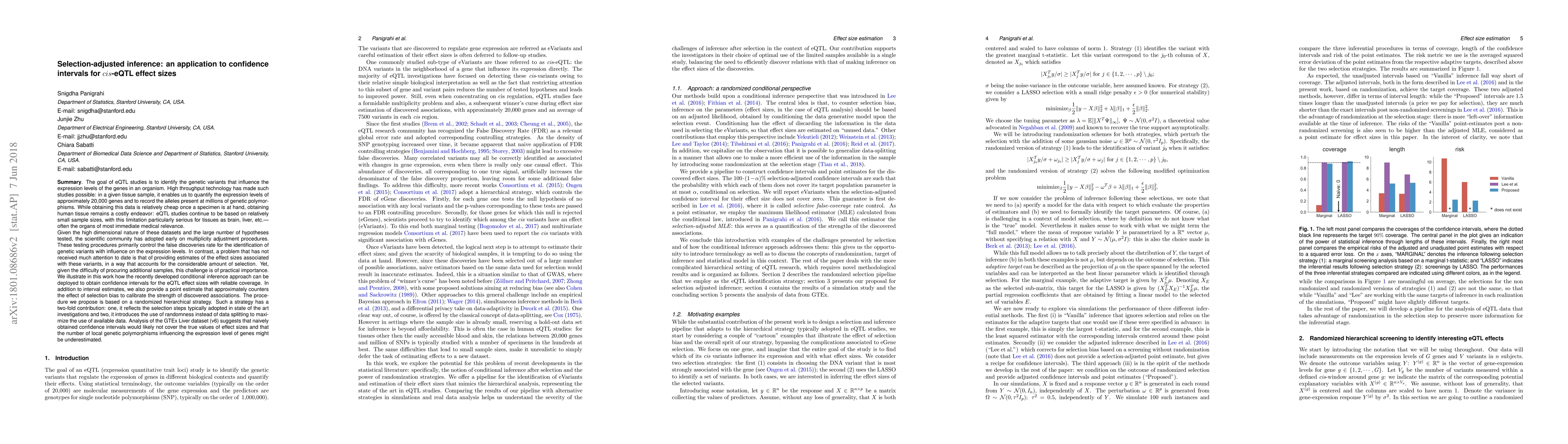 The goal of eQTL studies is to identify the genetic variants that influence the expression levels of the genes in an organism. High throughput technology has made such studies possible: in a given tissue sample, it enables us to quantify the expression levels of approximately 20,000 genes and to record the alleles present at millions of genetic polymorphisms. While obtaining this data is relatively cheap once a specimen is at hand, obtaining human tissue remains a costly endeavor. Thus, eQTL studies continue to be based on relatively small sample sizes, with this limitation particularly serious for tissues of most immediate medical relevance. Given the high dimensional nature of this datasets and the large number of hypotheses tested, the scientific community has adopted early on multiplicity adjustment procedures, which primarily control the false discoveries rate for the identification of genetic variants with influence on the expression levels. In contrast, a problem that has not received much attention to date is that of providing estimates of the effect sizes associated to these variants, in a way that accounts for the considerable amount of selection. We illustrate how the recently developed conditional inference approach can be deployed to obtain confidence intervals for the eQTL effect sizes with reliable coverage. The procedure we propose is based on a randomized hierarchical strategy that both reflects the steps typically adopted in state of the art investigations and introduces the use of randomness instead of data splitting to maximize the use of available data. Analysis of the GTEx Liver dataset (v6) suggests that naively obtained confidence intervals would likely not cover the true values of effect sizes and that the number of local genetic polymorphisms influencing the expression level of genes might be underestimated.