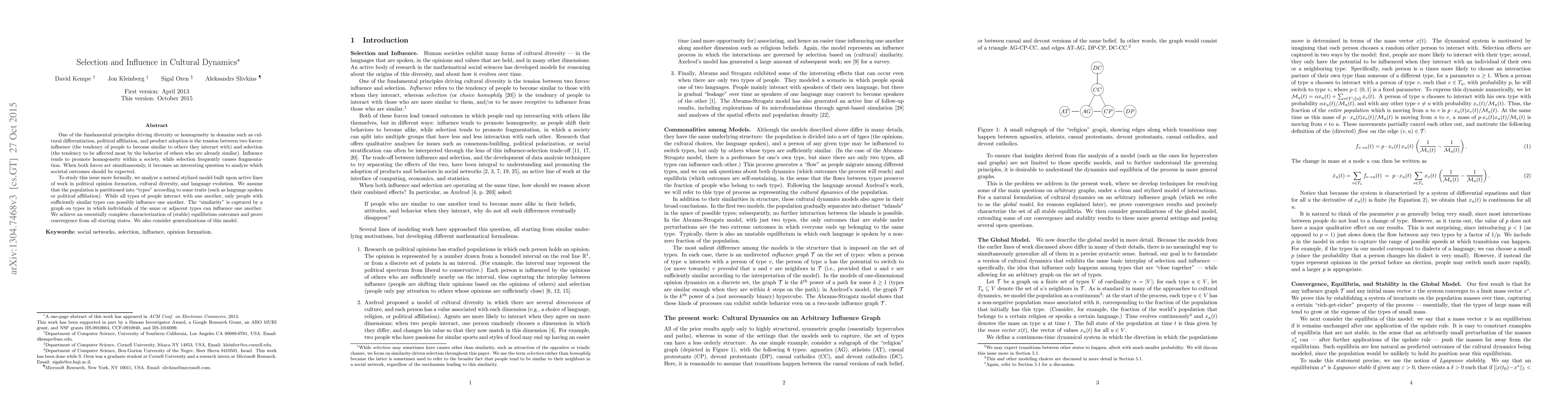 One of the fundamental principles driving diversity or homogeneity in domains such as cultural differentiation, political affiliation, and product adoption is the tension between two forces: influence (the tendency of people to become similar to others they interact with) and selection (the tendency to be affected most by the behavior of others who are already similar). Influence tends to promote homogeneity within a society, while selection frequently causes fragmentation. When both forces act simultaneously, it becomes an interesting question to analyze which societal outcomes should be expected. To study this issue more formally, we analyze a natural stylized model built upon active lines of work in political opinion formation, cultural diversity, and language evolution. We assume that the population is partitioned into "types" according to some traits (such as language spoken or political affiliation). While all types of people interact with one another, only people with sufficiently similar types can possibly influence one another. The "similarity" is captured by a graph on types in which individuals of the same or adjacent types can influence one another. We achieve an essentially complete characterization of (stable) equilibrium outcomes and prove convergence from all starting states. We also consider generalizations of this model.