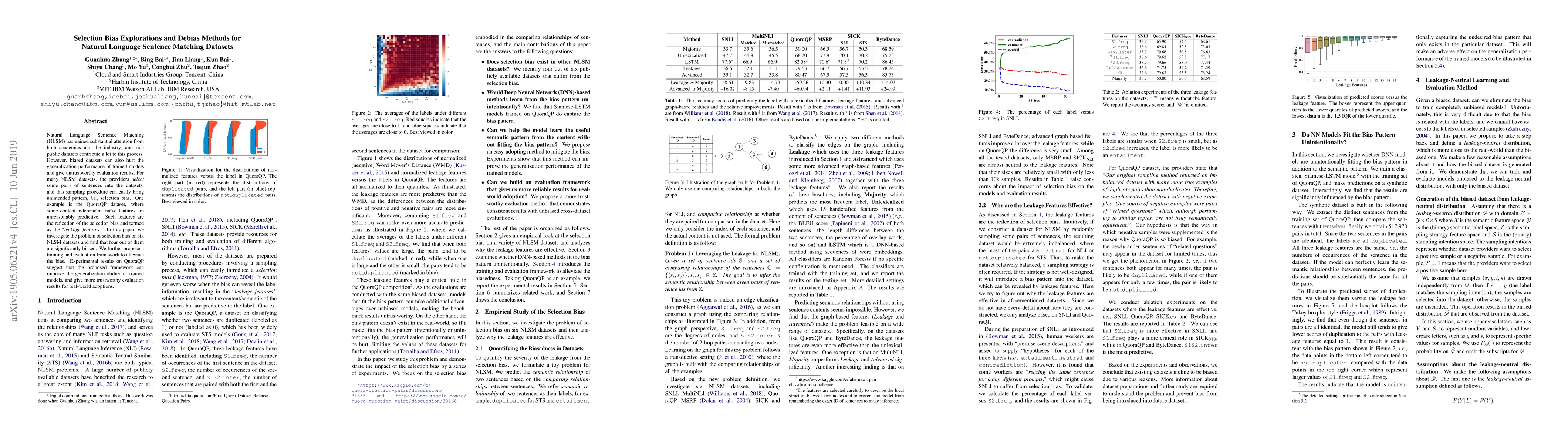 This paper investigates selection bias in six Natural Language Sentence Matching datasets, finding significant bias in four. It proposes a framework to mitigate this bias, demonstrating improved generalization and more reliable evaluation results on the QuoraQP dataset.