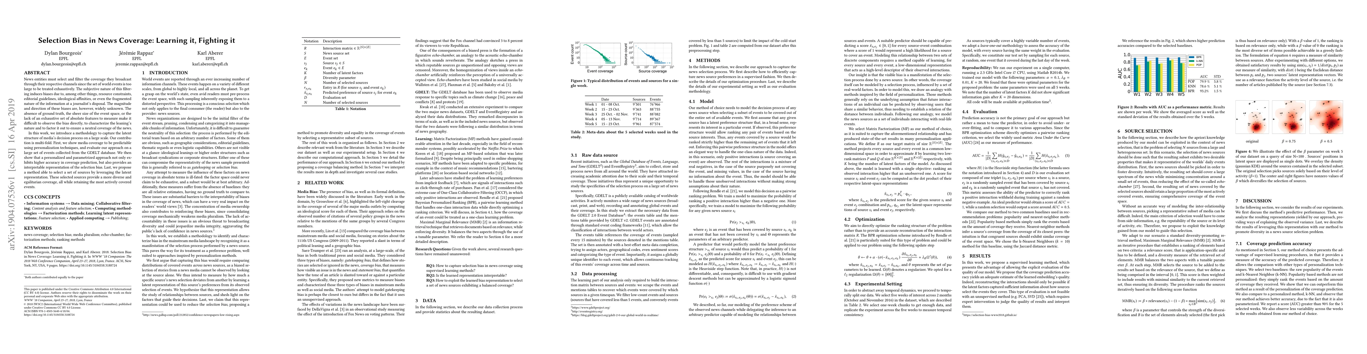 This paper introduces a methodology to identify and mitigate selection bias in news coverage by analyzing media's decision-making processes. It uses personalization techniques to predict media coverage and demonstrates that a parametrized approach can provide an interpretable representation of selection bias, ultimately proposing a method to select diverse sources for more balanced news reporting.