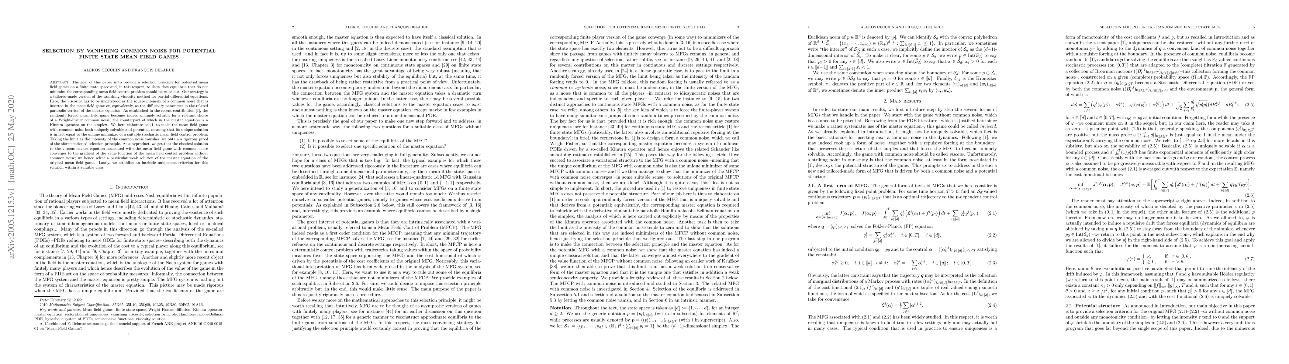 The goal of this paper is to provide a selection principle for potential mean field games on a finite state space and, in this respect, to show that equilibria that do not minimize the corresponding mean field control problem should be ruled out. Our strategy is a tailored-made version of the vanishing viscosity method for partial differential equations. Here, the viscosity has to be understood as the square intensity of a common noise that is inserted in the mean field game or, equivalently, as the diffusivity parameter in the related parabolic version of the master equation. As established recently, the randomly forced mean field game becomes indeed uniquely solvable for a relevant choice of a Wright-Fisher common noise, the counterpart of which in the master equation is a Kimura operator on the simplex. We here elaborate on this idea to make the mean field game with common noise both uniquely solvable and potential, meaning that its unique solution is in fact equal to the unique minimizer of a suitable stochastic mean field control problem. Taking the limit as the intensity of the common noise vanishes, we obtain a rigorous proof of the aforementioned selection principle. As a byproduct, we get that the classical solution to the viscous master equation associated with the mean field game with common noise converges to the gradient of the value function of the mean field control problem without common noise; we hence select a particular weak solution of the master equation of the original mean field game. Lastly, we establish an intrinsic uniqueness criterion for this solution within a suitable class.