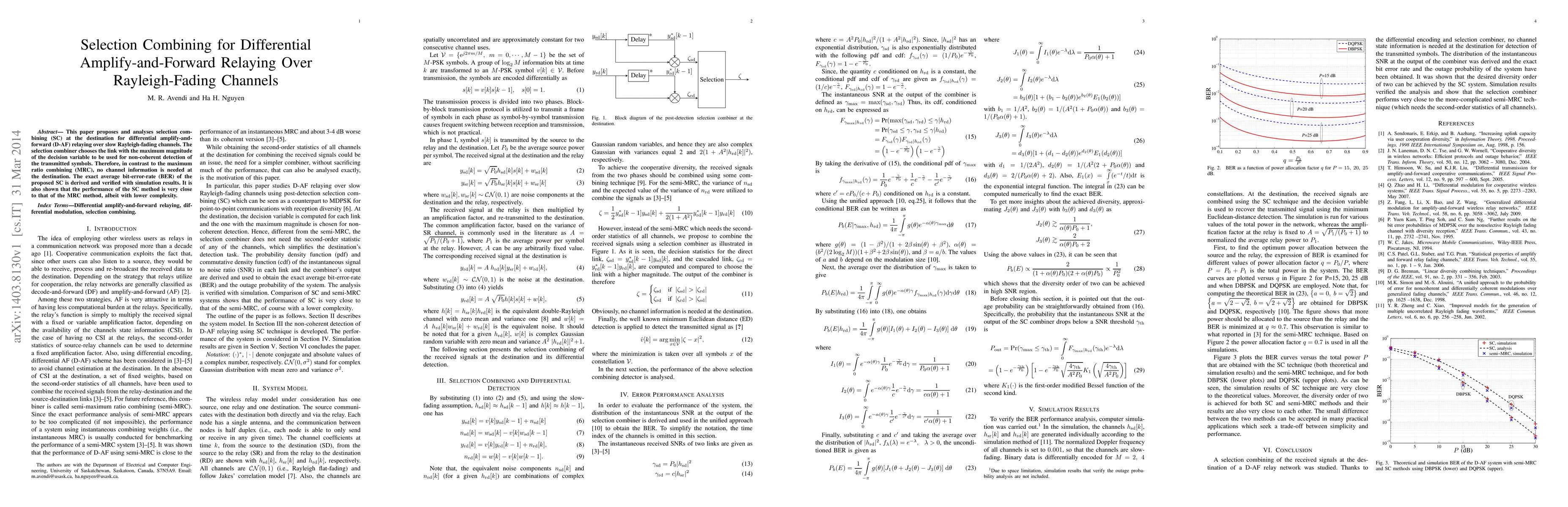 This paper proposes selection combining (SC) at the destination for differential amplify-and-forward relaying over Rayleigh-fading channels, achieving non-coherent detection without requiring channel information. The exact average bit-error-rate (BER) is derived and shown to be nearly as effective as maximum ratio combining (MRC) but with lower complexity.
