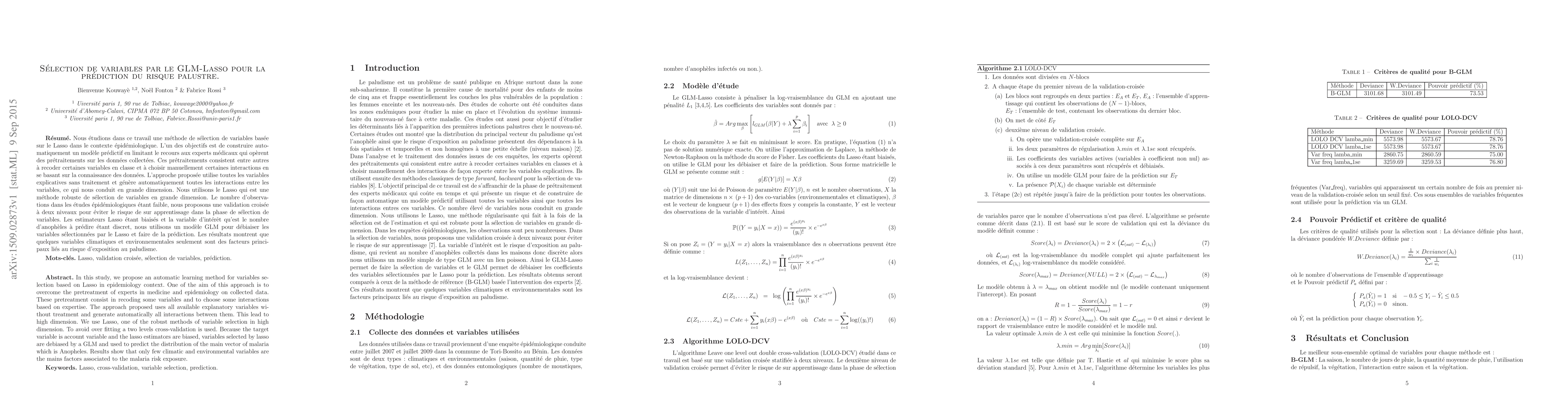 In this study, we propose an automatic learning method for variables selection based on Lasso in epidemiology context. One of the aim of this approach is to overcome the pretreatment of experts in medicine and epidemiology on collected data. These pretreatment consist in recoding some variables and to choose some interactions based on expertise. The approach proposed uses all available explanatory variables without treatment and generate automatically all interactions between them. This lead to high dimension. We use Lasso, one of the robust methods of variable selection in high dimension. To avoid over fitting a two levels cross-validation is used. Because the target variable is account variable and the lasso estimators are biased, variables selected by lasso are debiased by a GLM and used to predict the distribution of the main vector of malaria which is Anopheles. Results show that only few climatic and environmental variables are the mains factors associated to the malaria risk exposure.