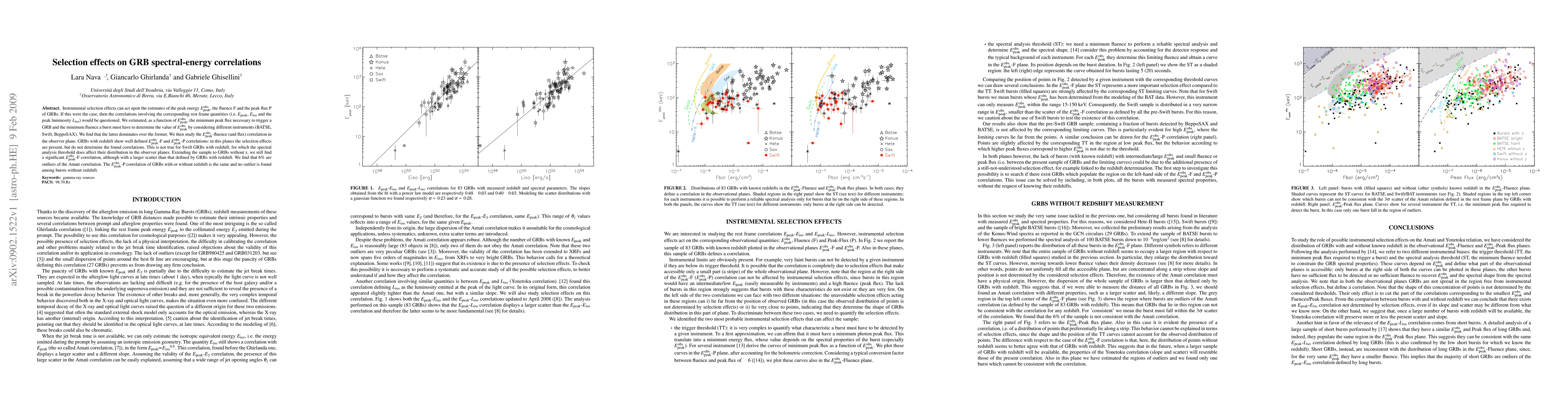 Instrumental selection effects can act upon the estimates of the peak energy Ep, the fluence F and the peak flux P of GRBs. If this were the case, then the correlations involving the corresponding rest frame quantities (i.e. Ep, Eiso and the peak luminosity Liso) would be questioned. We estimated, as a function of Ep, the minimum peak flux necessary to trigger a GRB and the minimum fluence a burst must have to determine the value of Ep by considering different instruments (BATSE, Swift, BeppoSAX). We find that the latter dominates over the former. We then study the Ep-fluence (and flux) correlation in the observer plane. GRBs with redshift show well defined Ep-F and Ep-P correlations: in this planes the selection effects are present, but do not determine the found orrelations. This is not true for Swift GRBs with redshift, for which the spectral analysis threshold does affect their distribution in the observer planes. Extending the sample to GRBs without z, we still find a significant Ep-F correlation, although with a larger scatter than that defined by GRBs with redshift. We find that 6% are outliers of the Amati correlation. The Ep-P correlation of GRBs with or without redshift is the same and no outlier is found among bursts without redshift.