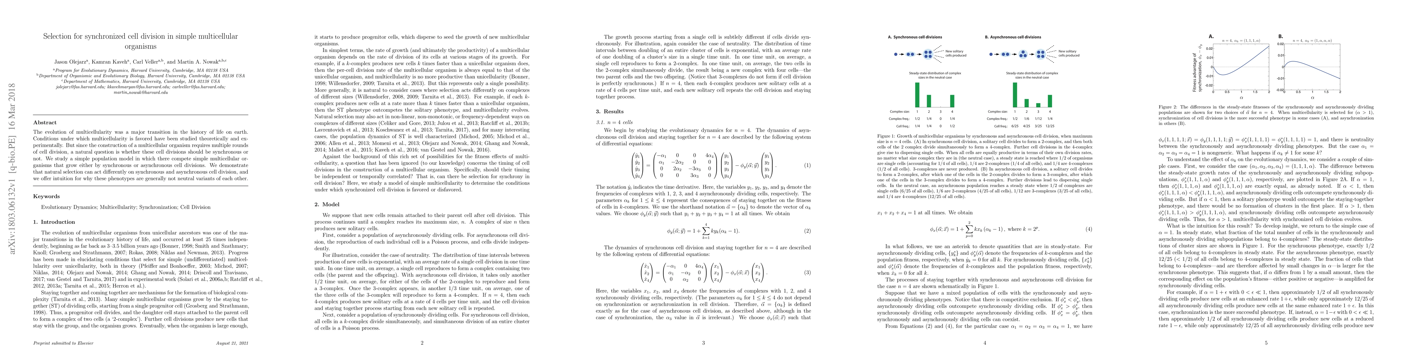 This paper investigates the evolutionary dynamics of synchronized versus asynchronous cell division in simple multicellular organisms, demonstrating that natural selection favors different strategies depending on the division type, providing insight into why these division patterns are not neutral alternatives.