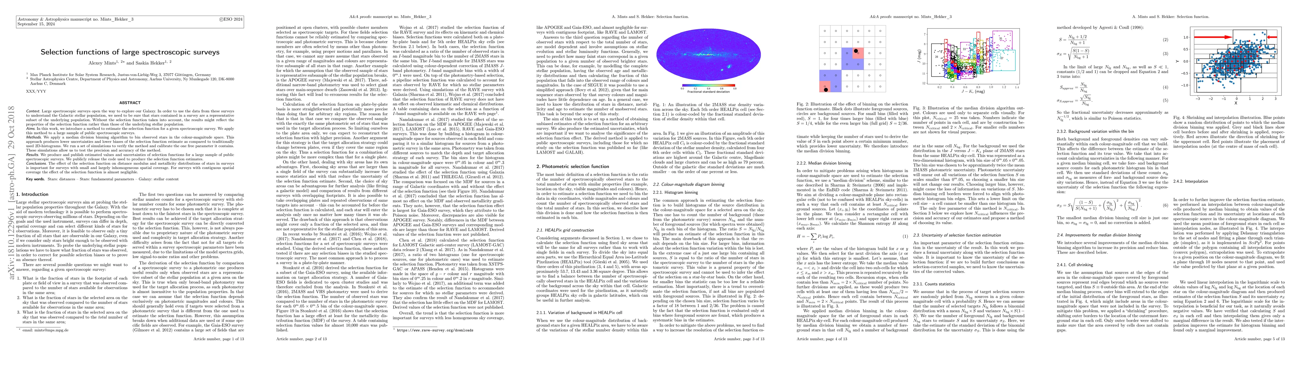 This paper introduces a method to estimate the selection function of large spectroscopic surveys, applying a median division binning algorithm to improve the precision and accuracy of the estimates. The method is verified through simulations and applied to a large sample of public surveys, highlighting the importance of accounting for selection functions in interpreting survey data.