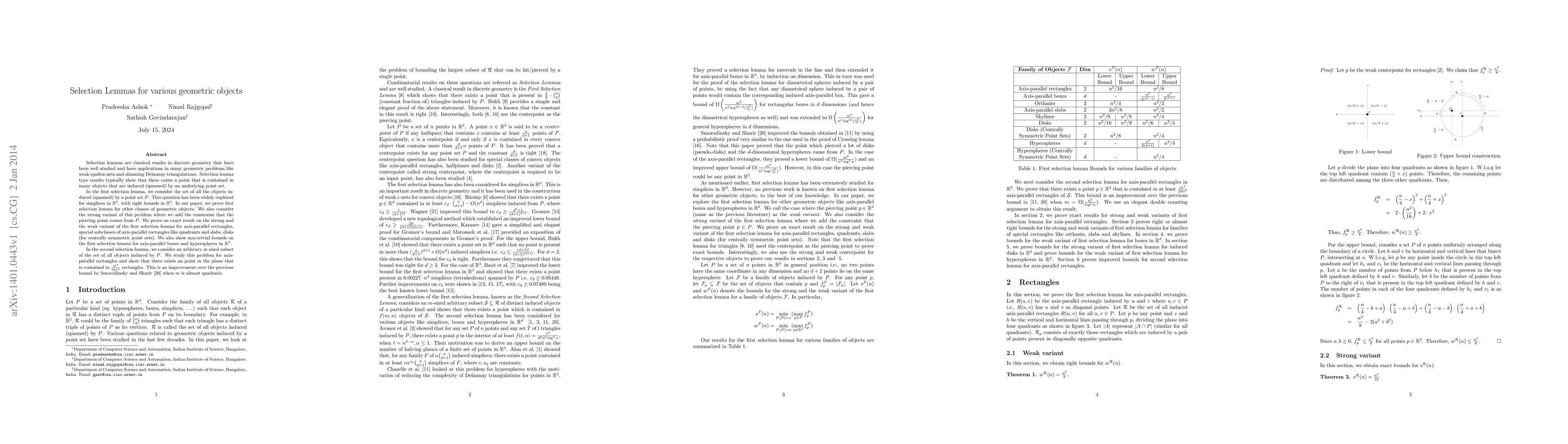 Selection lemmas are classical results in discrete geometry that have been well studied and have applications in many geometric problems like weak epsilon nets and slimming Delaunay triangulations. Selection lemma type results typically show that there exists a point that is contained in many objects that are induced (spanned) by an underlying point set. In the first selection lemma, we consider the set of all the objects induced (spanned) by a point set $P$. This question has been widely explored for simplices in $\mathbb{R}^d$, with tight bounds in $\mathbb{R}^2$. In our paper, we prove first selection lemma for other classes of geometric objects. We also consider the strong variant of this problem where we add the constraint that the piercing point comes from $P$. We prove an exact result on the strong and the weak variant of the first selection lemma for axis-parallel rectangles, special subclasses of axis-parallel rectangles like quadrants and slabs, disks (for centrally symmetric point sets). We also show non-trivial bounds on the first selection lemma for axis-parallel boxes and hyperspheres in $\mathbb{R}^d$. In the second selection lemma, we consider an arbitrary $m$ sized subset of the set of all objects induced by $P$. We study this problem for axis-parallel rectangles and show that there exists an point in the plane that is contained in $\frac{m^3}{24n^4}$ rectangles. This is an improvement over the previous bound by Smorodinsky and Sharir when $m$ is almost quadratic.
