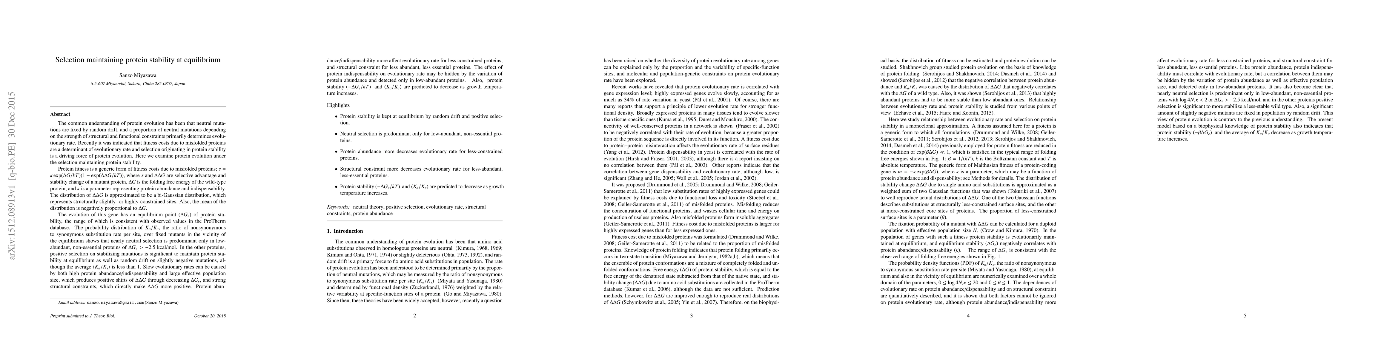 The common understanding of protein evolution has been that neutral or slightly deleterious mutations are fixed by random drift, and evolutionary rate is determined primarily by the proportion of neutral mutations. However, recent studies have revealed that highly expressed genes evolve slowly because of fitness costs due to misfolded proteins. Here we study selection maintaining protein stability. Protein fitness is taken to be $s = \kappa \exp(\beta\Delta G) (1 - \exp(\beta\Delta\Delta G))$, where $s$ and $\Delta\Delta G$ are selective advantage and stability change of a mutant protein, $\Delta G$ is the folding free energy of the wild-type protein, and $\kappa$ represents protein abundance and indispensability. The distribution of $\Delta\Delta G$ is approximated to be a bi-Gaussian function, which represents structurally slightly- or highly-constrained sites. Also, the mean of the distribution is negatively proportional to $\Delta G$. The evolution of this gene has an equilibrium ($\Delta G_e$) of protein stability, the range of which is consistent with experimental values. The probability distribution of $K_a/K_s$, the ratio of nonsynonymous to synonymous substitution rate per site, over fixed mutants in the vicinity of the equilibrium shows that nearly neutral selection is predominant only in low-abundant, non-essential proteins of $\Delta G_e > -2.5$ kcal/mol. In the other proteins, positive selection on stabilizing mutations is significant to maintain protein stability at equilibrium as well as random drift on slightly negative mutations, although the average $\langle K_a/K_s \rangle$ is less than 1. Slow evolutionary rates can be caused by high protein abundance/indispensability, which produces positive shifts of $\Delta\Delta G$ through decreasing $\Delta G_e$, and by strong structural constraints, which directly make $\Delta\Delta G$ more positive.