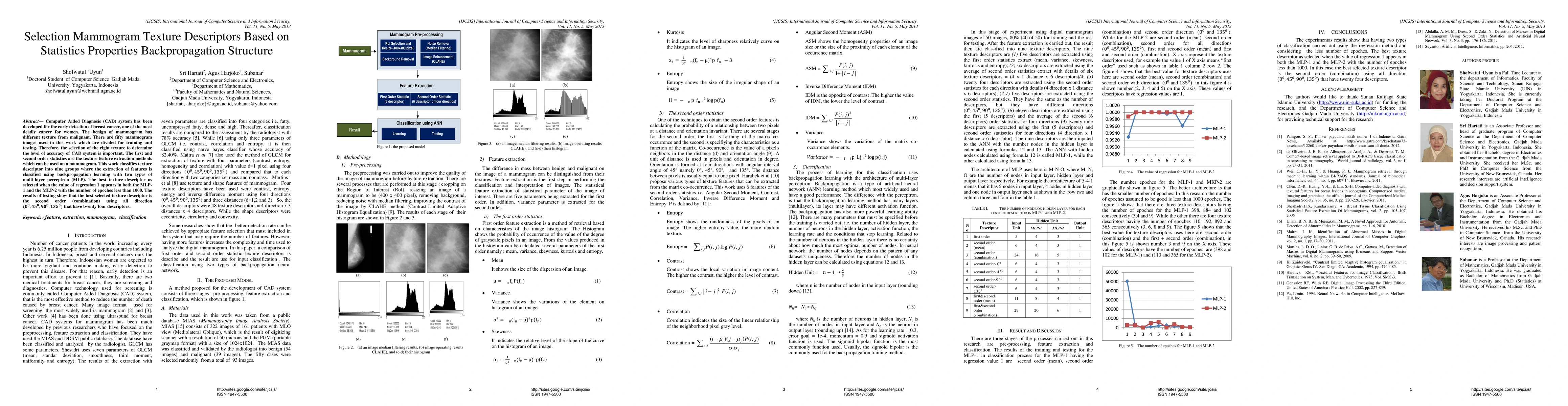 A study used mammogram images to develop a computer-aided diagnosis system for breast cancer detection. It found that a second-order texture descriptor with four directions achieved the best accuracy results.