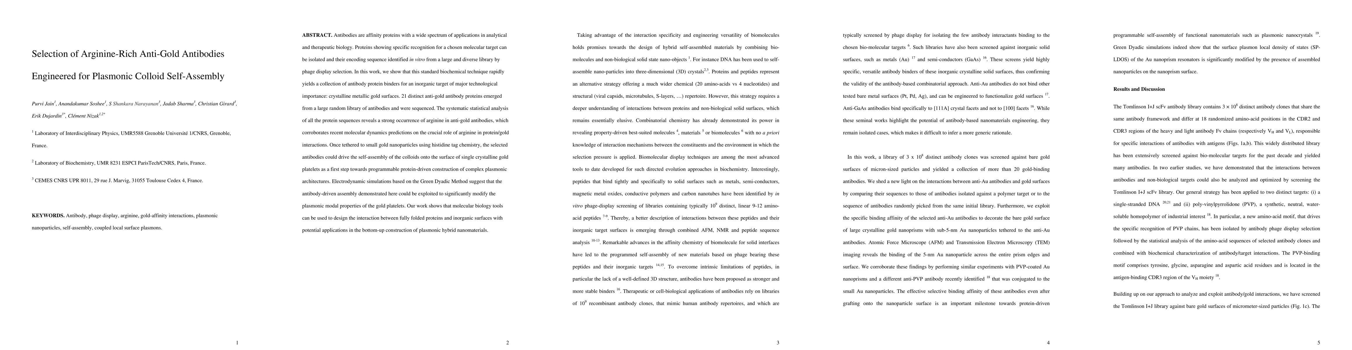 This paper demonstrates the use of phage display selection to engineer 21 distinct anti-gold antibodies, highlighting a significant prevalence of arginine in their sequences. These antibodies can self-assemble gold nanoparticles onto crystalline gold surfaces, potentially enabling the bottom-up construction of complex plasmonic nanomaterials.