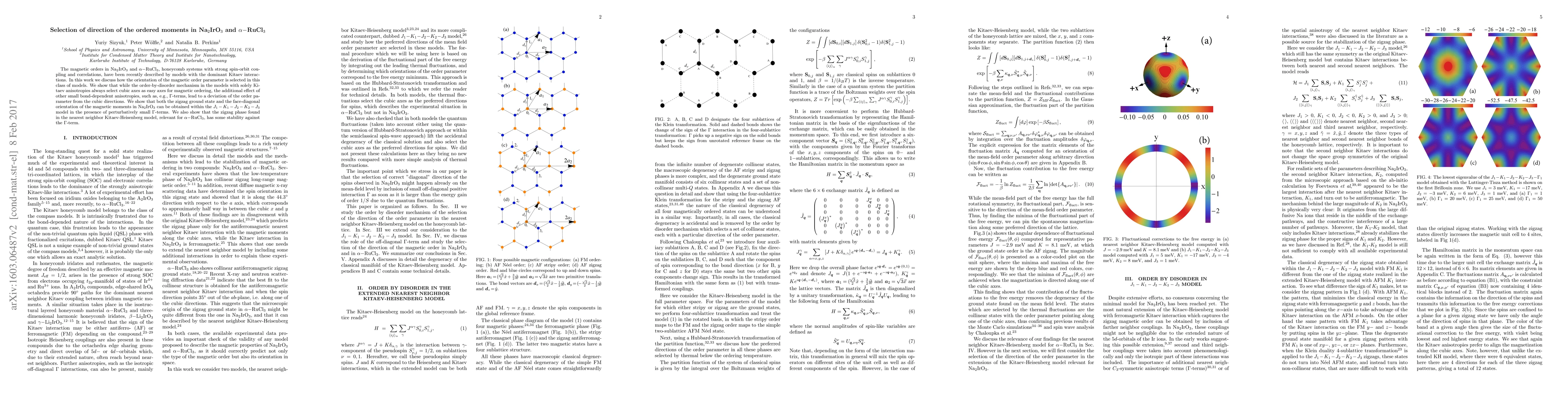 The magnetic orders in Na$_2$IrO$_3$ and $\alpha-$RuCl$_3$, honeycomb systems with strong spin-orbit coupling and correlations, have been recently described by models with the dominant Kitaev interactions. In this work we discuss how the orientation of magnetic order parameter is selected in this class of models. We show that while the order-by-disorder mechanism in the models with solely Kitaev anisotropies always select cubic axes as easy axes for magnetic ordering, the additional effect of other small bond-dependent anisotropies, such as, e.g., $\Gamma$-terms, lead to a deviation of the order parameter from the cubic directions. We show that both the zigzag ground state and the face-diagonal orientation of magnetic moments in Na$_2$IrO$_3$ can be obtained within the $J_1-K_1-J_2-K_2-J_3$ model in the presence of perturbatively small $\Gamma$-terms. We also show that the zigzag phase found in the nearest neighbor Kitaev-Heisenberg model, relevant for $\alpha-$RuCl$_3$, has some stability against the $\Gamma$-term.