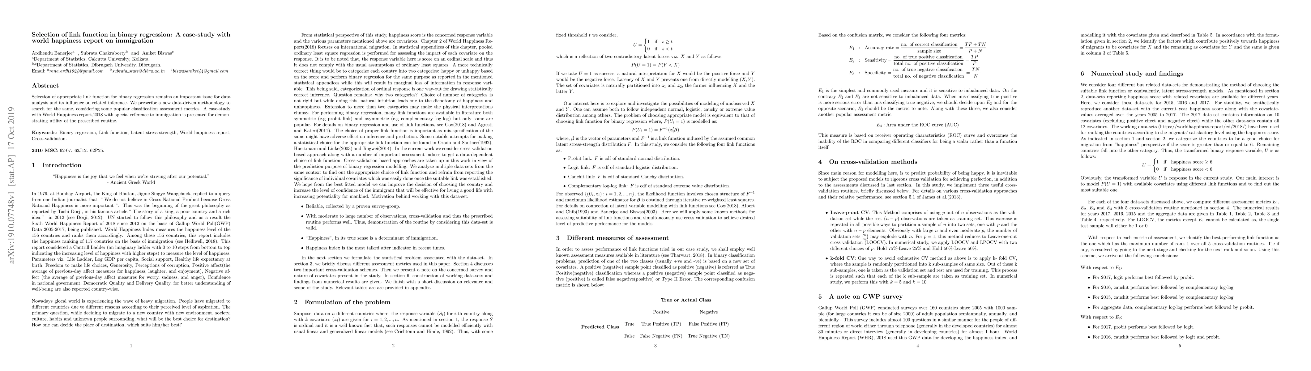 Selection of appropriate link function for binary regression remains an important issue for data analysis and its influence on related inference. We prescribe a new data-driven methodology to search for the same, considering some popular classification assessment metrics. A case-study with World Happiness report,2018 with special reference to immigration is presented for demonstrating utility of the prescribed routine.