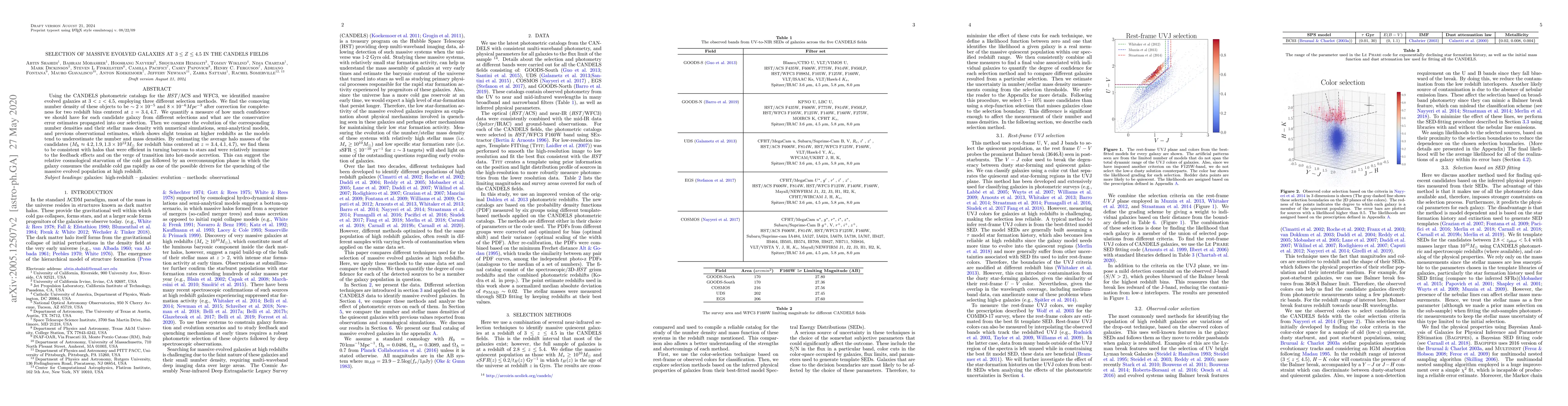 Using the CANDELS photometric catalogs for the HST/ACS and WFC3, we identified massive evolved galaxies at $3 < z < 4.5$, employing three different selection methods. We find the comoving number density of these objects to be $\sim 2 \times 10^{-5}$ and $8 \times 10^{-6}Mpc^{-3}$ after correction for completeness for two redshift bins centered at $z=3.4, 4.7$. We quantify a measure of how much confidence we should have for each candidate galaxy from different selections and what are the conservative error estimates propagated into our selection. Then we compare the evolution of the corresponding number densities and their stellar mass density with numerical simulations, semi-analytical models, and previous observational estimates, which shows slight tension at higher redshifts as the models tend to underestimate the number and mass densities. By estimating the average halo masses of the candidates ($M_h \approx 4.2, 1.9, 1.3 \times 10^{12} M_\odot$ for redshift bins centered at $z=3.4, 4.1, 4.7$), we find them to be consistent with halos that were efficient in turning baryons to stars and were relatively immune to the feedback effects and on the verge of transition into hot-mode accretion. This can suggest the relative cosmological starvation of the cold gas followed by an overconsumption phase in which the galaxy consumes the available cold gas rapidly as one of the possible drivers for the quenching of the massive evolved population at high redshift.