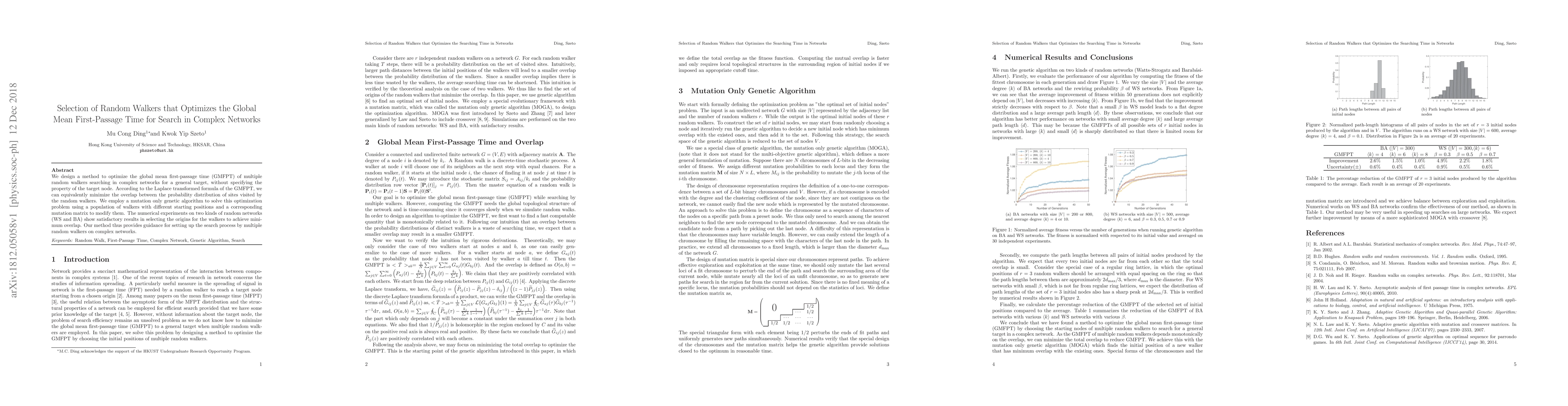 This paper proposes a genetic algorithm to optimize the global mean first-passage time for multiple random walkers searching in complex networks. The method minimizes the overlap between the walkers' visited sites, leading to efficient search strategies without needing specific target node properties.