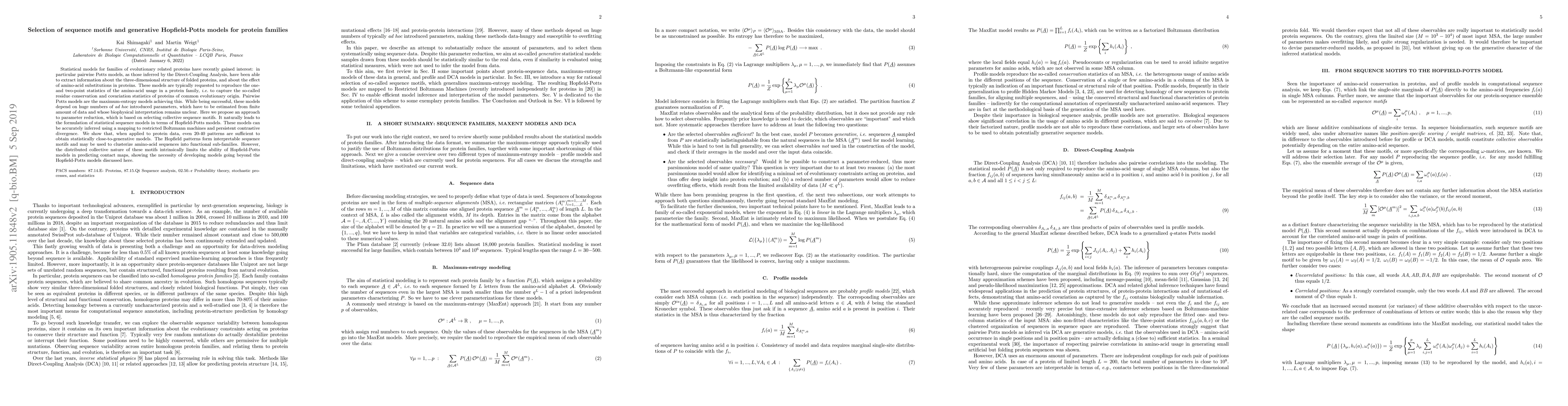This paper proposes a method to reduce parameters in statistical models for protein families by selecting collective sequence motifs, leading to Hopfield-Potts models. These models, inferred via mapping to restricted Boltzmann machines, provide interpretable sequence motifs and can cluster sequences into functional sub-families, though they have limitations in predicting contact maps.