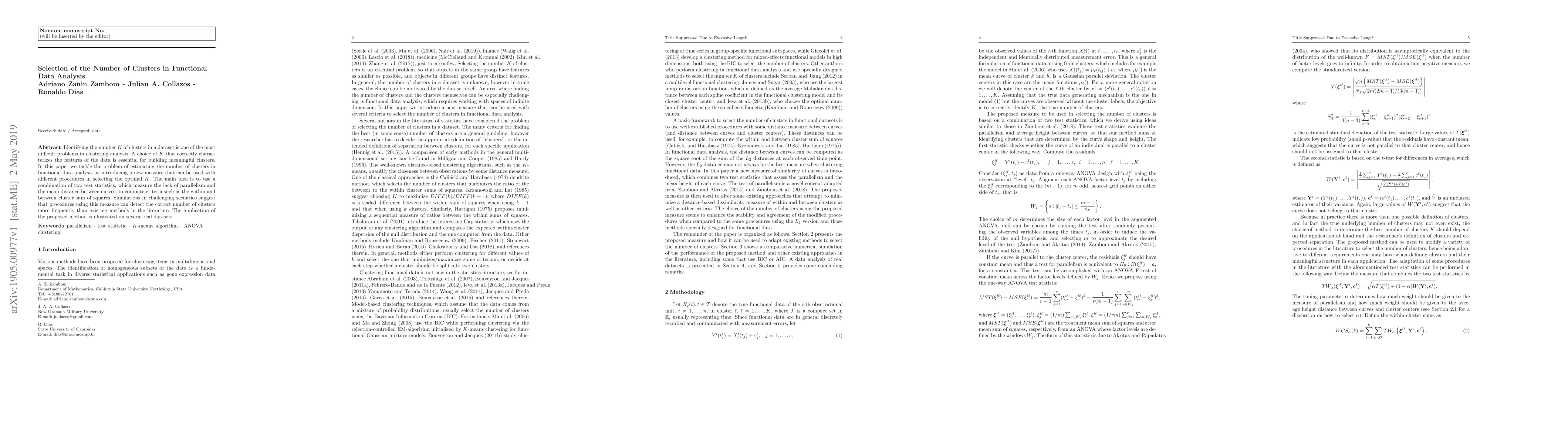 A new method is proposed to estimate the number of clusters in functional data analysis, which combines two test statistics to detect correct clustering numbers more frequently than existing methods.
