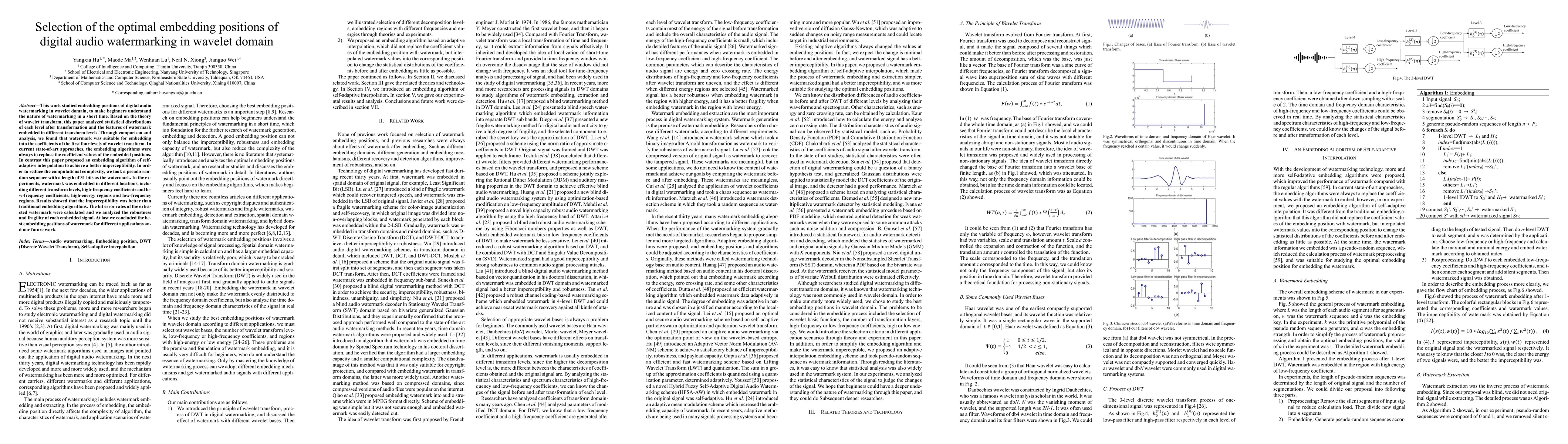 This paper investigates optimal embedding positions for digital audio watermarks in the wavelet domain, finding that the first four levels of wavelet transform coefficients are most suitable. It proposes a self-adaptive interpolation embedding algorithm for better imperceptibility and concludes that specific locations within these levels yield superior performance in terms of robustness and imperceptibility compared to traditional methods.