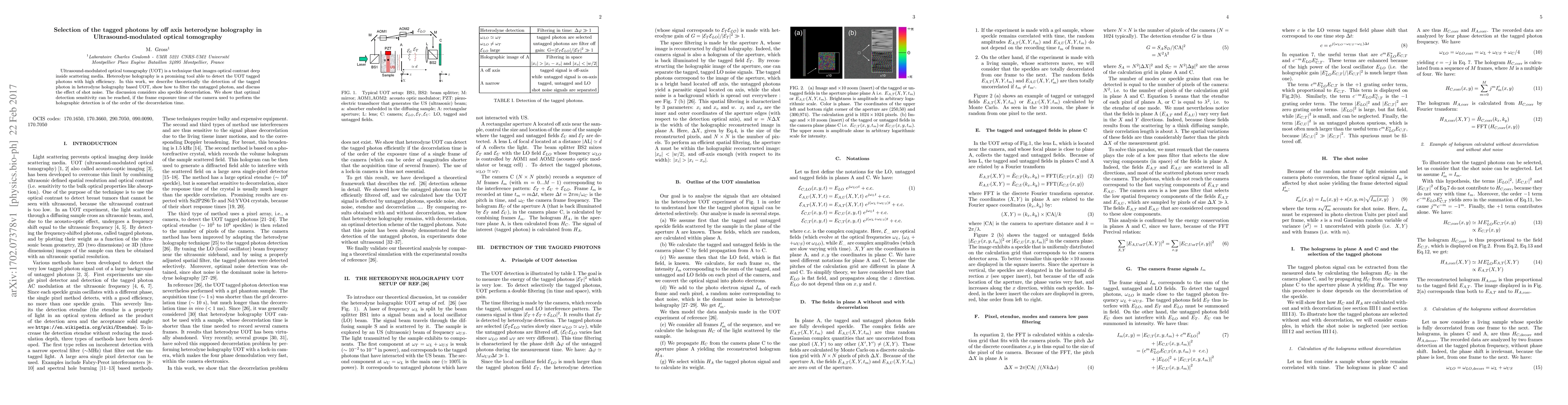 Ultrasound-modulated optical tomography (UOT) is a technique that images optical contrast deep inside scattering media. Heterodyne holography is a promising tool able to detect the UOT tagged photons with high efficiency. In this work, we describe theoretically the detection of the tagged photon in heterodyne holography based UOT, show how to filter the untagged photon, and discuss the effect of shot noise. The discussion considers also speckle decorrelation. We show that optimal detection sensitivity can be reached, if the frame exposure time of the camera used to perform the holographic detection is of the order of the decorrelation time.