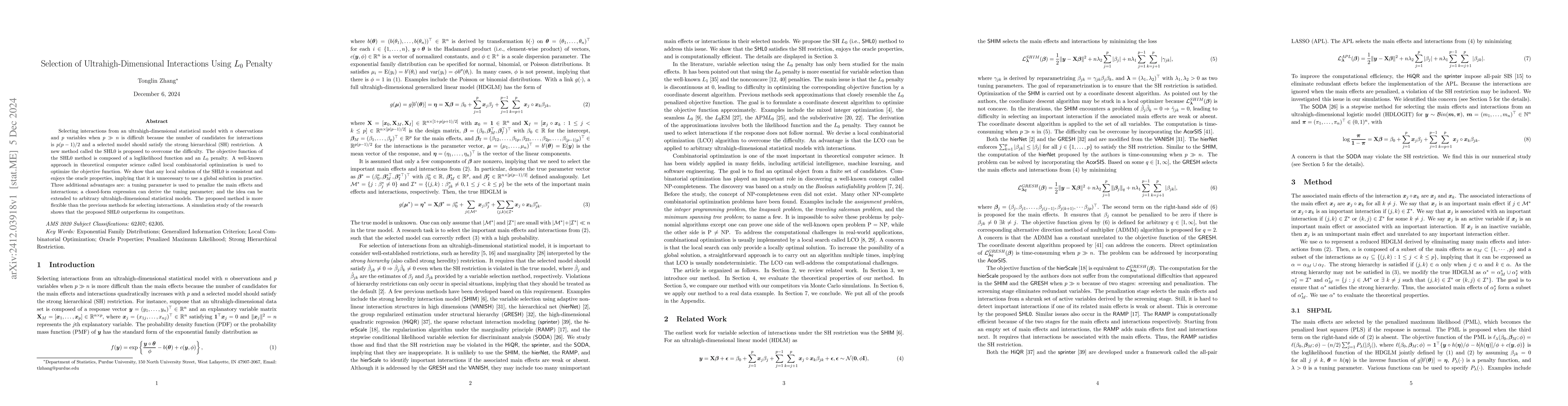 This paper introduces the SHL0 method, an innovative approach for selecting interactions in ultrahigh-dimensional models with $p\gg n$. Combining an $L_0$ penalty with local combinatorial optimization, SHL0 ensures consistency and oracle properties, offering flexibility and outperforming existing methods.