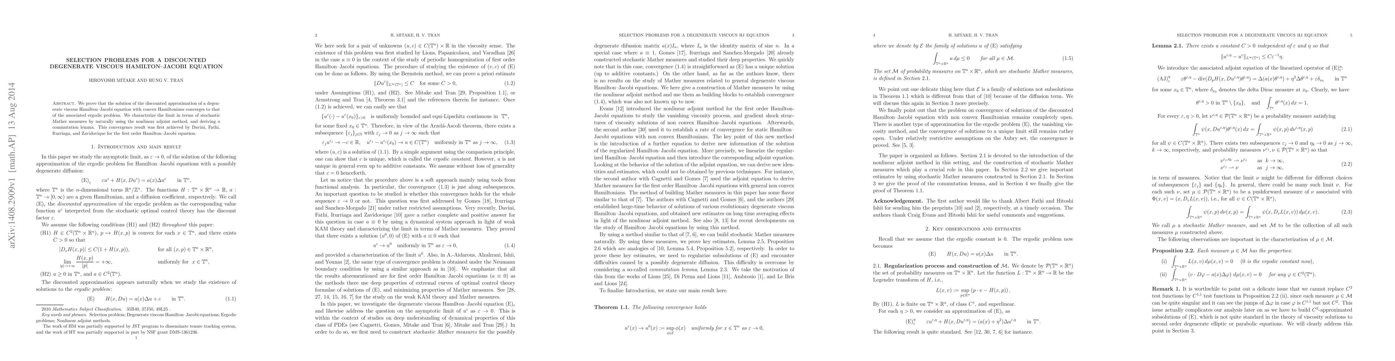The paper proves the convergence of the solution to the discounted approximation of a degenerate viscous Hamilton-Jacobi equation to the solution of the associated ergodic problem, utilizing stochastic Mather measures and a nonlinear adjoint method. This extends previous convergence results for the first-order Hamilton-Jacobi equation.