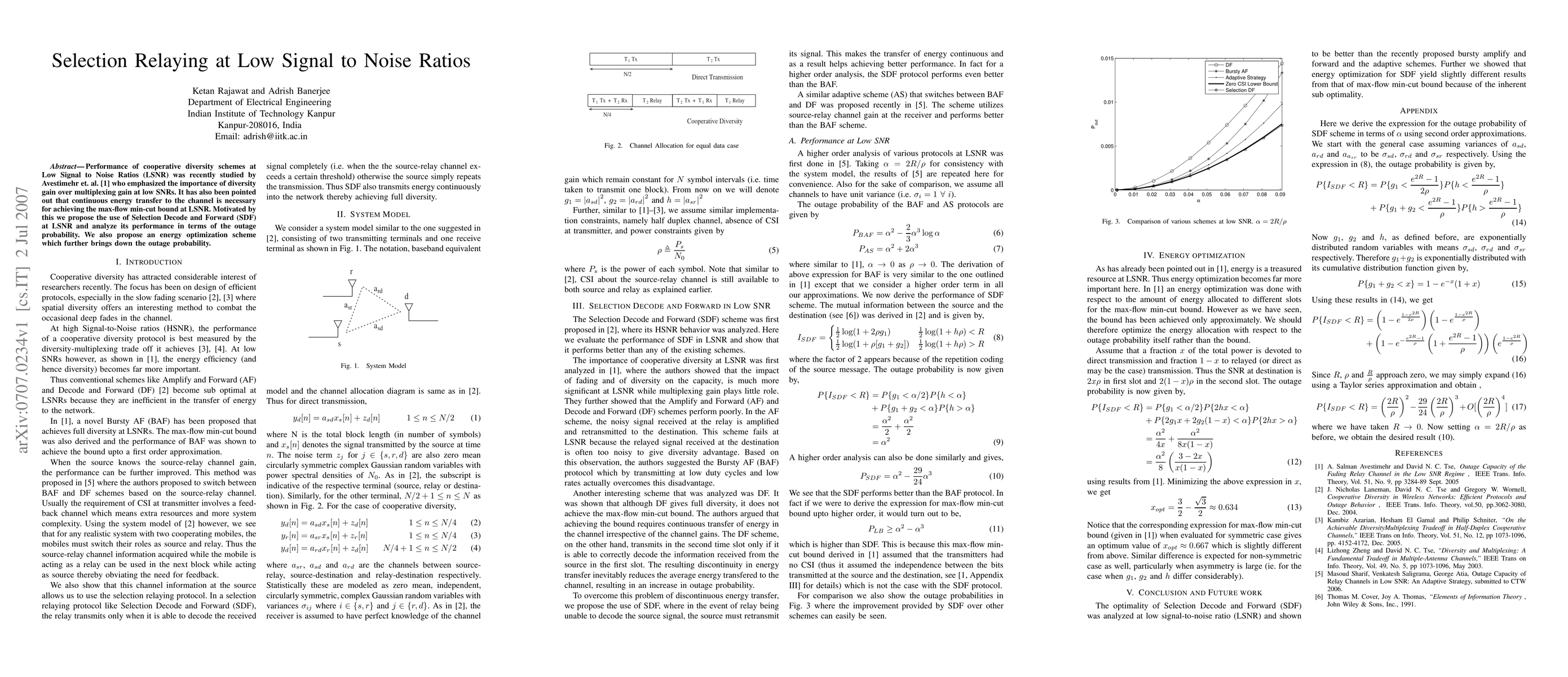 The research proposes the use of Selection Decode and Forward (SDF) at Low Signal to Noise Ratios (LSNR) and analyzes its performance in terms of outage probability. It also introduces an energy optimization scheme to further reduce outage probability.