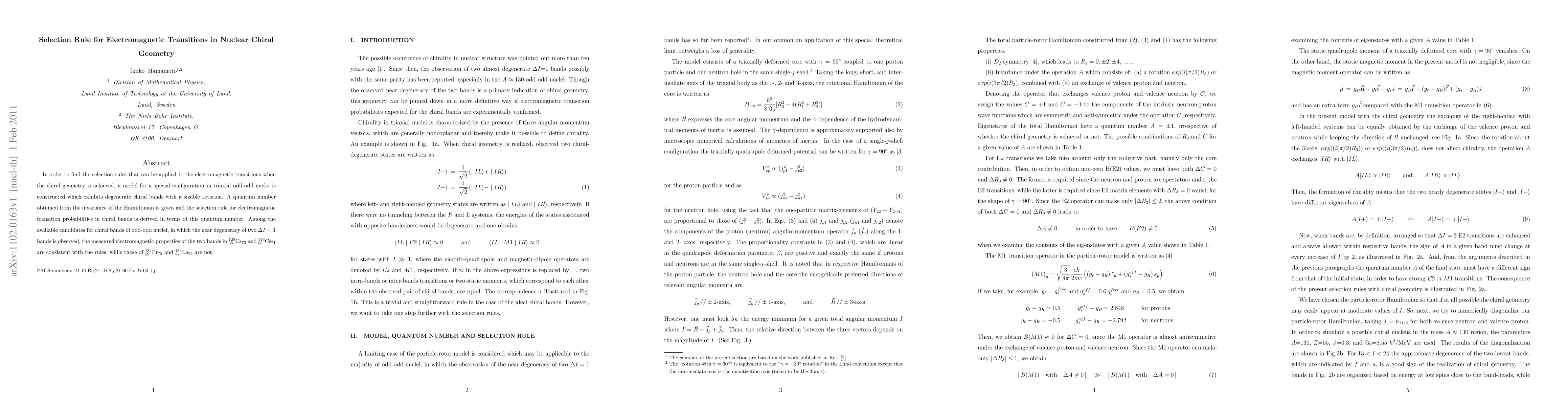 This paper constructs a model for triaxial odd-odd nuclei to derive selection rules for electromagnetic transitions in chiral geometry, finding that the rules fit observed properties in $^{128}$Cs and $^{126}$Cs but not in $^{134}$Pr and $^{132}$La. The selection rules are expressed in terms of a quantum number derived from Hamiltonian invariance.