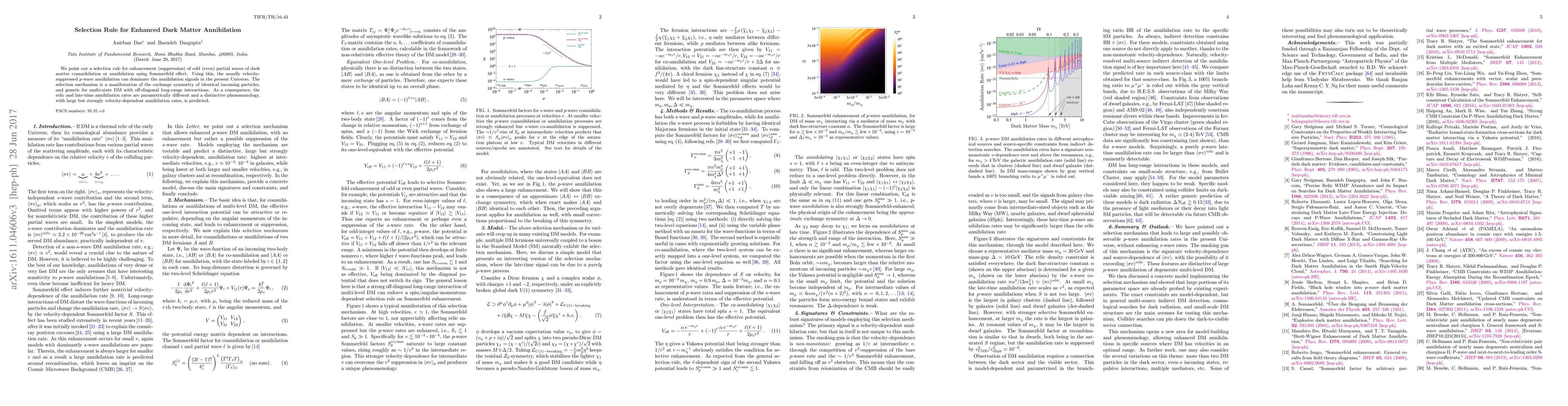 We point out a selection rule for enhancement (suppression) of odd (even) partial waves of dark matter coannihilation or annihilation using Sommerfeld effect. Using this, the usually velocity-suppressed p-wave annihilation can dominate the annihilation signals in the present Universe. The selection mechanism is a manifestation of the exchange symmetry of identical incoming particles, and generic for multi-state DM with off-diagonal long-range interactions. As a consequence, the relic and late-time annihilation rates are parametrically different and a distinctive phenomenology, with large but strongly velocity-dependent annihilation rates, is predicted.