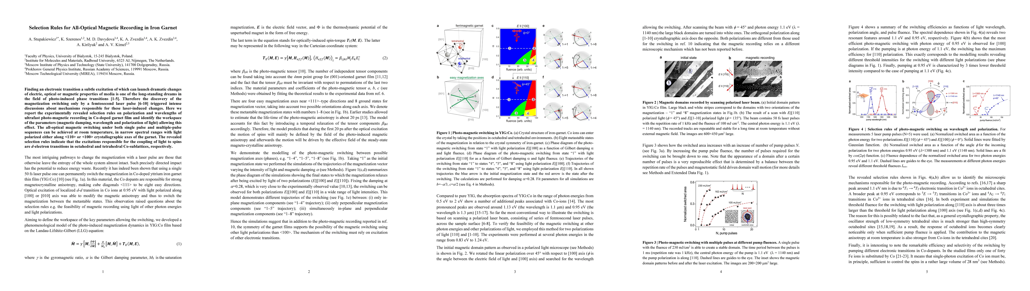 Finding an electronic transition a subtle excitation of which can launch dramatic changes of electric, optical or magnetic properties of media is one of the long-standing dreams in the field of photo-induced phase transitions [1-5]. Therefore the discovery of the magnetization switching only by a femtosecond laser pulse [6-10] triggered intense discussions about mechanisms responsible for these laser-induced changes. Here we report the experimentally revealed selection rules on polarization and wavelengths of ultrafast photo-magnetic recording in Co-doped garnet film and identify the workspace of the parameters (magnetic damping, wavelength and polarization of light) allowing this effect. The all-optical magnetic switching under both single pulse and multiple-pulse sequences can be achieved at room temperature, in narrow spectral ranges with light polarized either along <110> or <100> crystallographic axes of the garnet. The revealed selection rules indicate that the excitations responsible for the coupling of light to spins are d-electron transitions in octahedral and tetrahedral Co-sublattices, respectively.