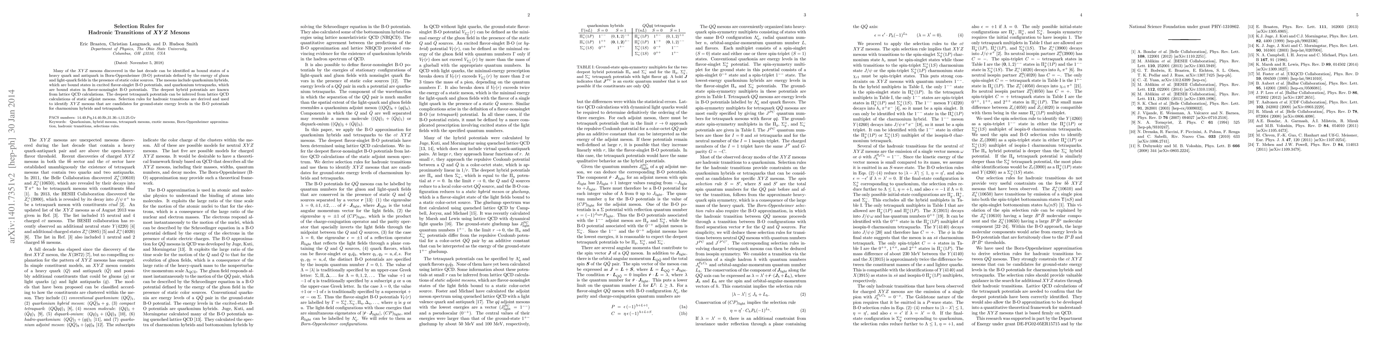Many of the XYZ mesons discovered in the last decade can be identified as bound states of a heavy quark and antiquark in Born-Oppenheimer (B-O) potentials defined by the energy of gluon and light-quark fields in the presence of static color sources. The mesons include quarkonium hybrids, which are bound states in excited flavor-singlet B-O potentials, and quarkonium tetraquarks, which are bound states in flavor-nonsinglet B-O potentials. The deepest hybrid potentials are known from lattice QCD calculations. The deepest tetraquark potentials can be inferred from lattice QCD calculations of static adjoint mesons. Selection rules for hadronic transitions are derived and used to identify XYZ mesons that are candidates for ground-state energy levels in the B-O potentials for charmonium hybrids and tetraquarks.
