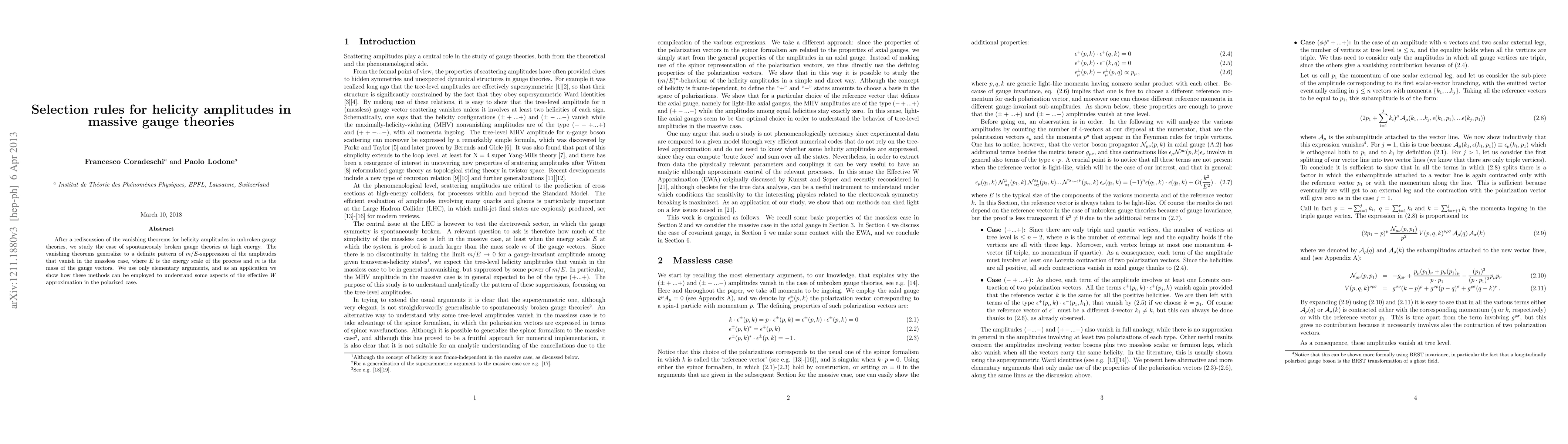 This paper discusses selection rules for helicity amplitudes in massive gauge theories, showing that vanishing theorems generalize to a pattern of m/E-suppression in spontaneously broken gauge theories, where m is the gauge vector mass and E is the energy scale. The methods are applied to understand aspects of the effective W approximation in polarized cases.