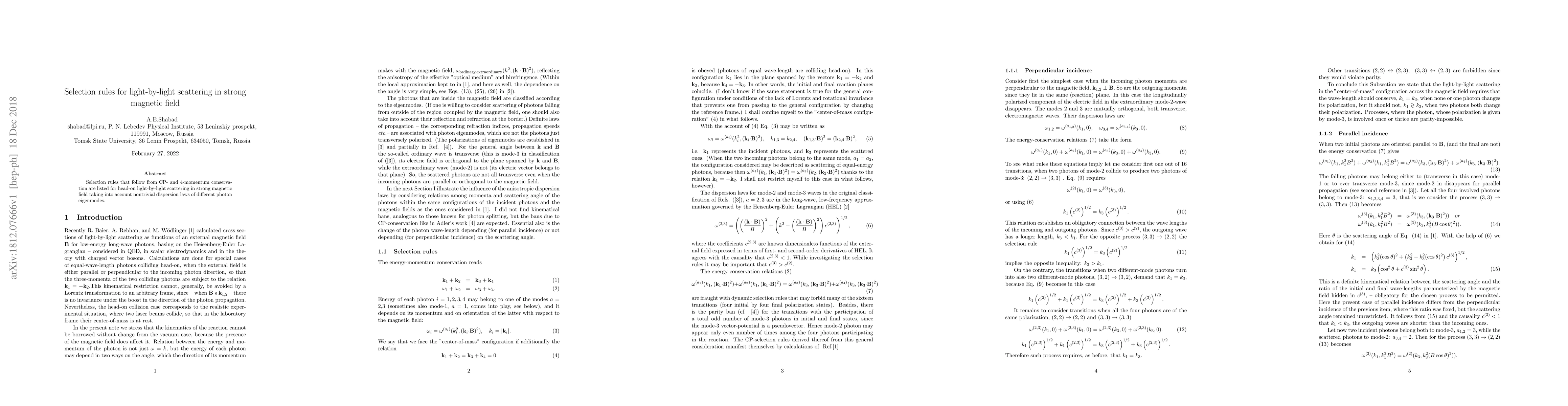 This paper outlines selection rules for light-by-light scattering in strong magnetic fields, emphasizing the role of CP symmetry and 4-momentum conservation, and considers the unique dispersion laws of photon eigenmodes. These rules provide insights into the behavior of photons under magnetic influences.