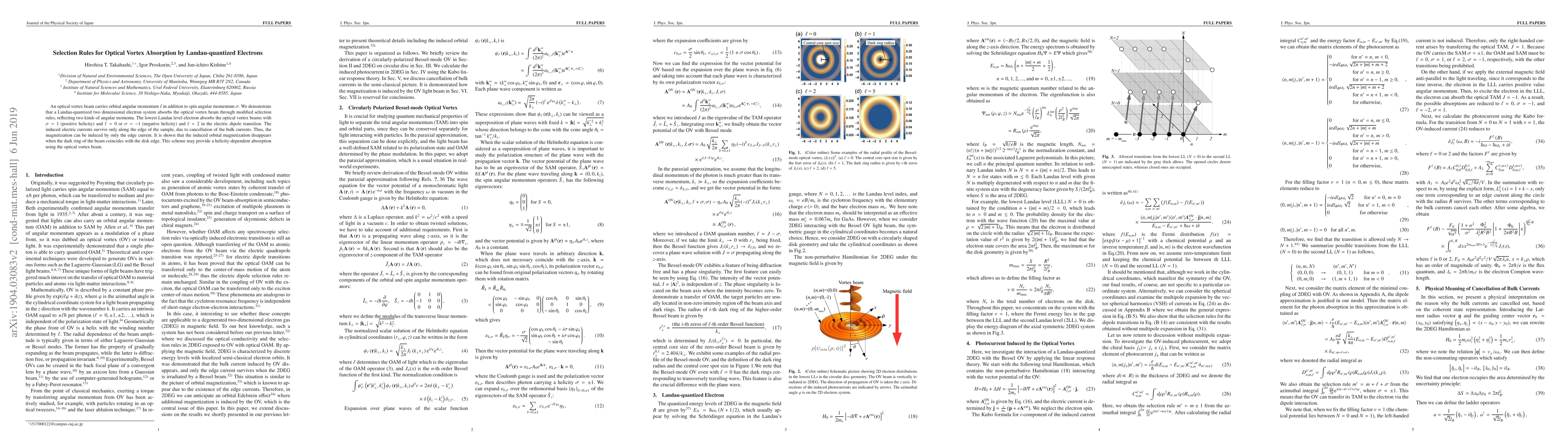 This paper demonstrates that Landau-quantized electrons in a two-dimensional system absorb optical vortex beams through modified selection rules based on the beam's orbital and spin angular momenta. The lowest Landau level electron absorbs beams with specific combinations of these angular momenta, leading to edge-localized induced electric currents and orbital magnetization.