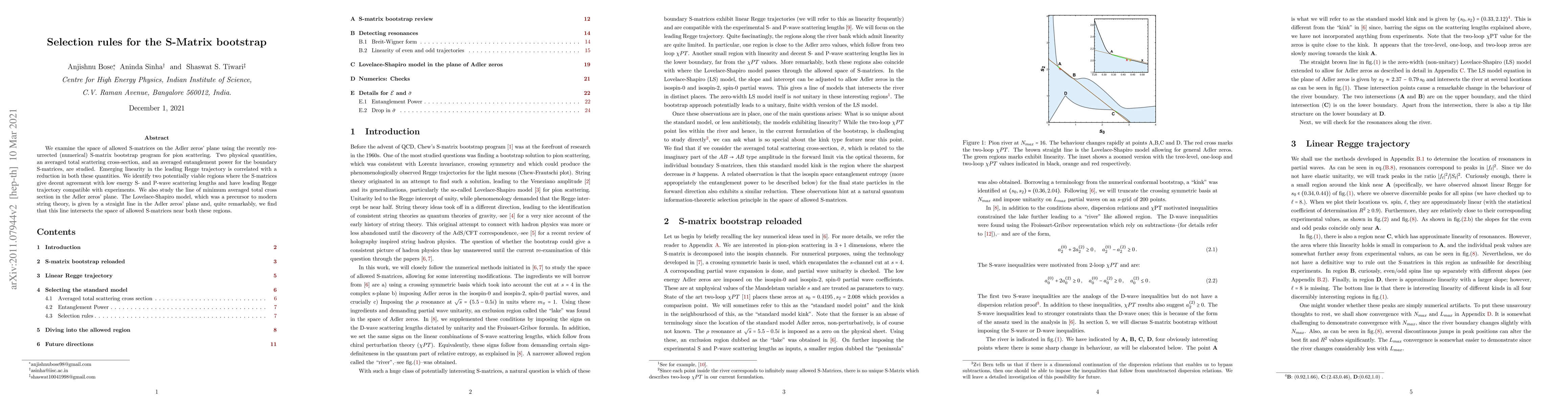 We examine the space of allowed S-matrices on the Adler zeros' plane using the recently resurrected (numerical) S-matrix bootstrap program for pion scattering. Two physical quantities, an averaged total scattering cross-section, and an averaged entanglement power for the boundary S-matrices, are studied. Emerging linearity in the leading Regge trajectory is correlated with a reduction in both these quantities. We identify two potentially viable regions where the S-matrices give decent agreement with low energy S- and P-wave scattering lengths and have leading Regge trajectory compatible with experiments. We also study the line of minimum averaged total cross section in the Adler zeros' plane. The Lovelace-Shapiro model, which was a precursor to modern string theory, is given by a straight line in the Adler zeros' plane and, quite remarkably, we find that this line intersects the space of allowed S-matrices near both these regions.