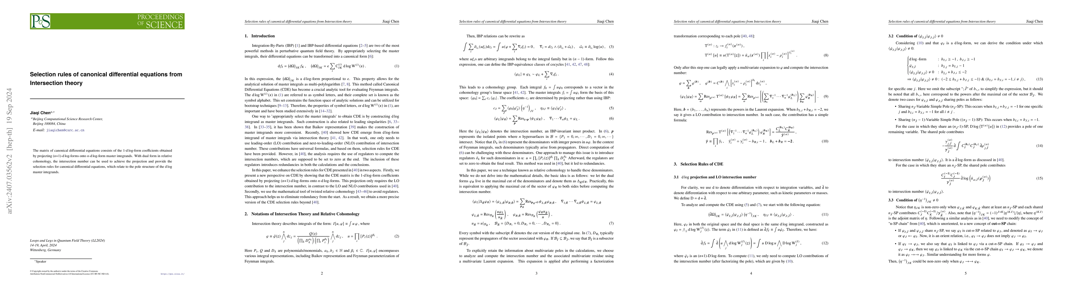 This paper explores how intersection theory can derive selection rules for canonical differential equations by projecting higher-dimensional differential forms onto lower-dimensional master integrands, using relative cohomology and intersection numbers to determine the pole structure.